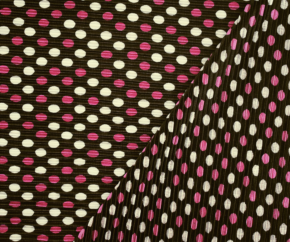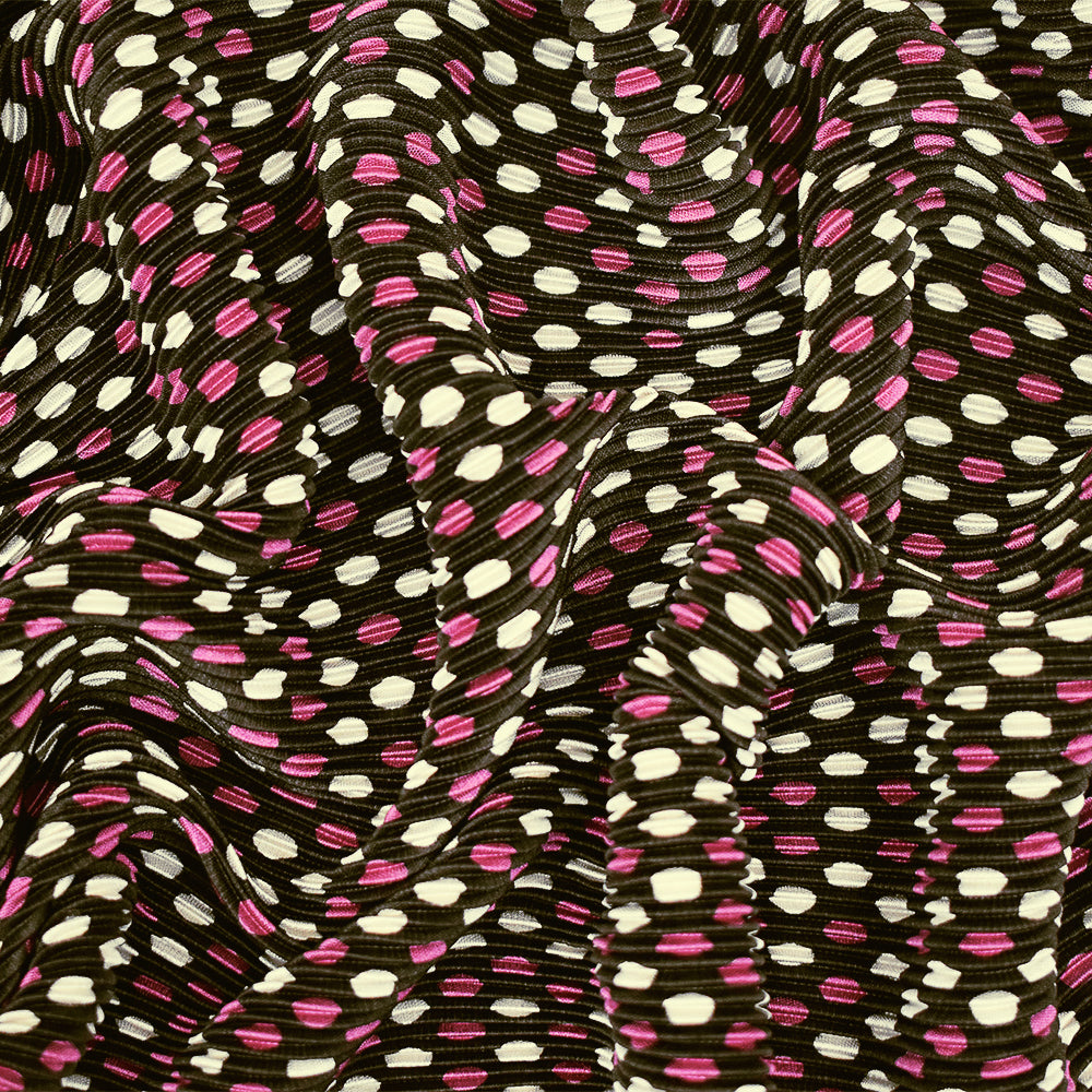 Brown-Pink-White Dot Printed Stretch Poly Pressed Pleated Satin Knit Fabric