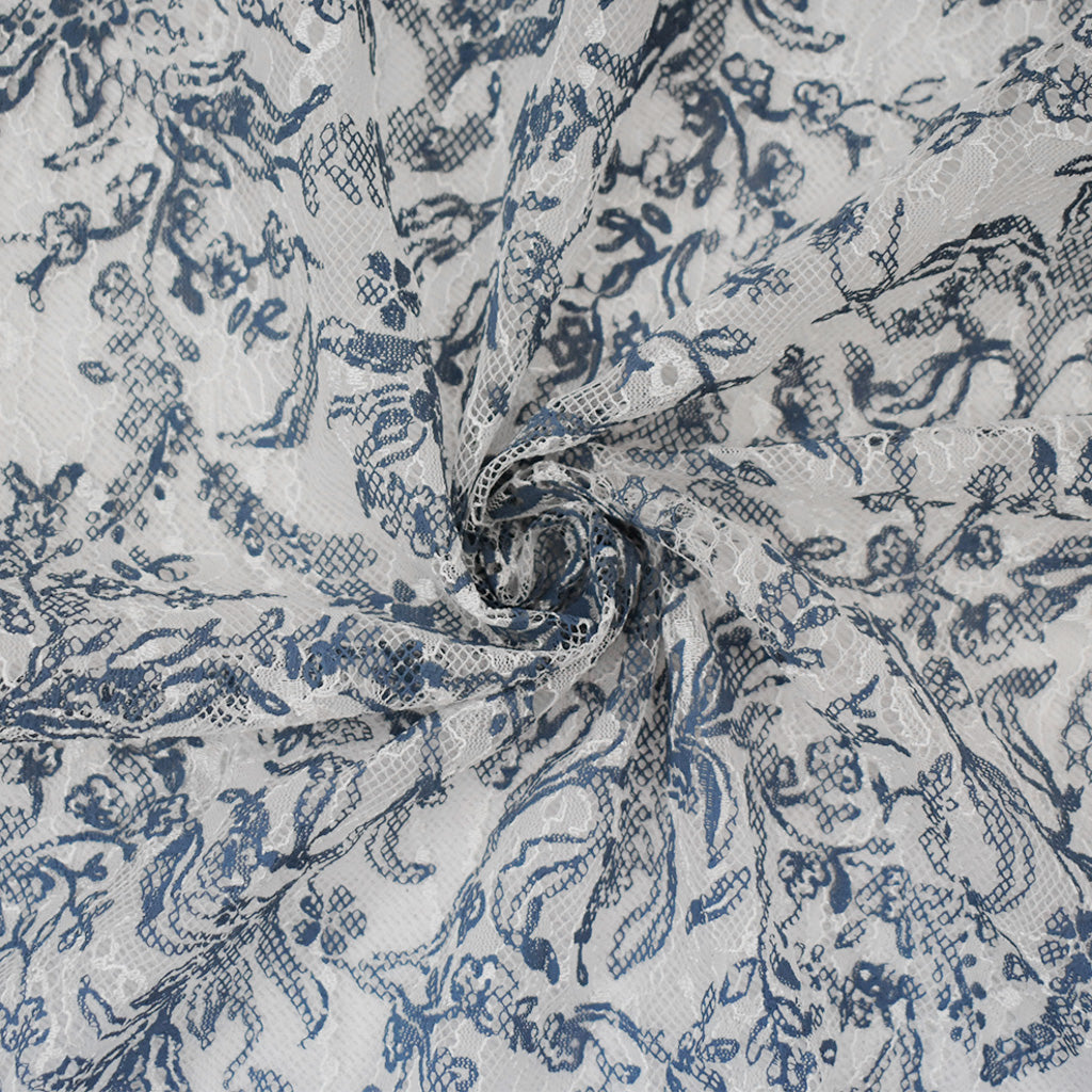 White-Blue Nylon Floral Vine Printed Lace Mesh Knit Fabric