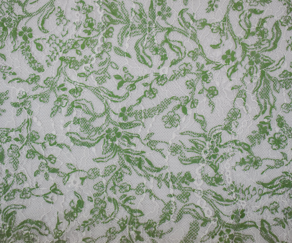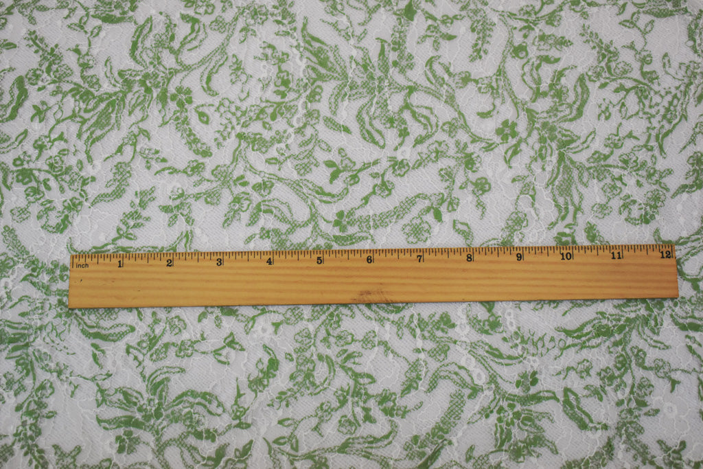 White-Green Nylon Floral Vine Printed Lace Mesh Knit Fabric