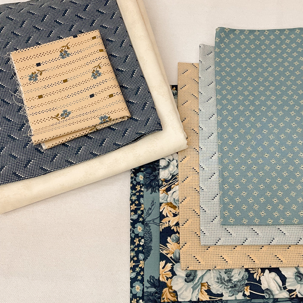 - Bundle fabrics include: 3/4 yd navy ivory dots dashes, 5/8 yd dusty blue yellow circle dot, 1/2 yd gray blue dots dashes, 1/2 yd beige blue dots dashes, 1/2 yd deep blue beige floral, 1/4 yd beige blue floral dot stripe, 1/2 yd deep blue floral, 3/4 yd deep blue yellow ditsy floral, 3 yds beige vine. Pattern is not included