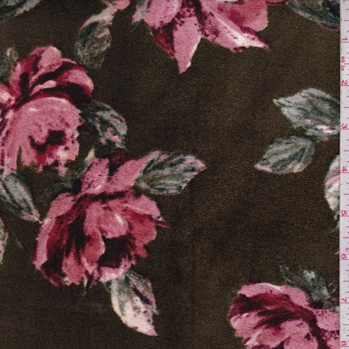 Dark Olive/Pink Floral Panne Velvet Knit Fabric