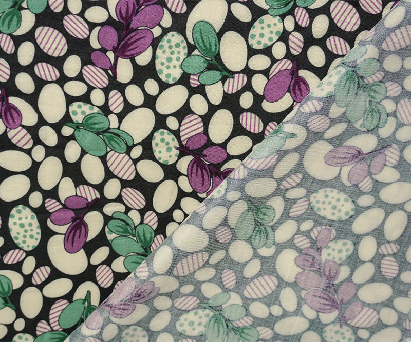 -This rayon challis features a contemporary pattern combining leaf and oval-like shaped motifs in a multi-color design. The soft, drapey weave is excellent for creating unique blouses and flowing artistic garments.