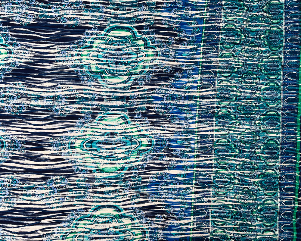 -Intricate blue and multi-colored medallion-inspired pattern with borders printed on a pleated knit fabric
