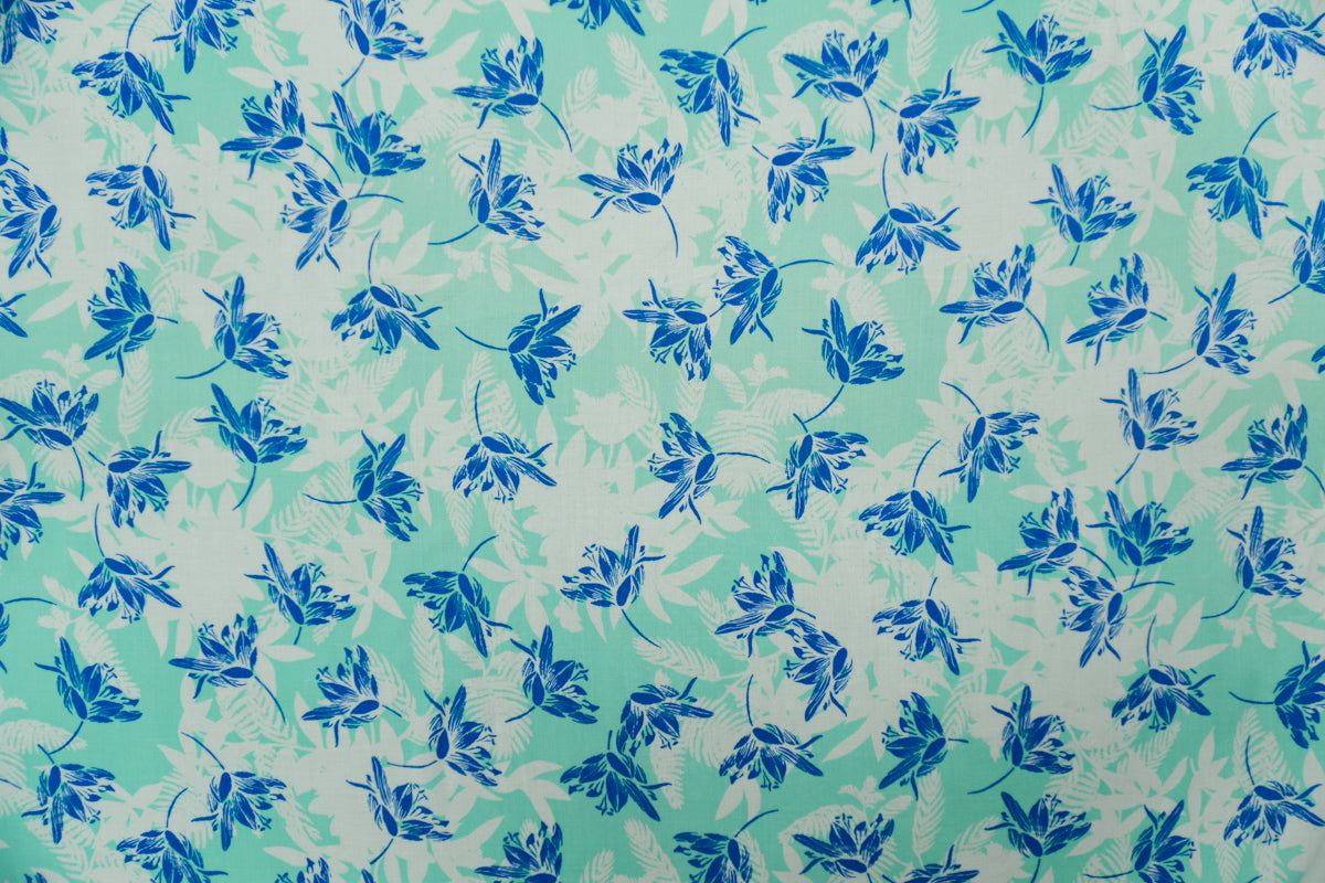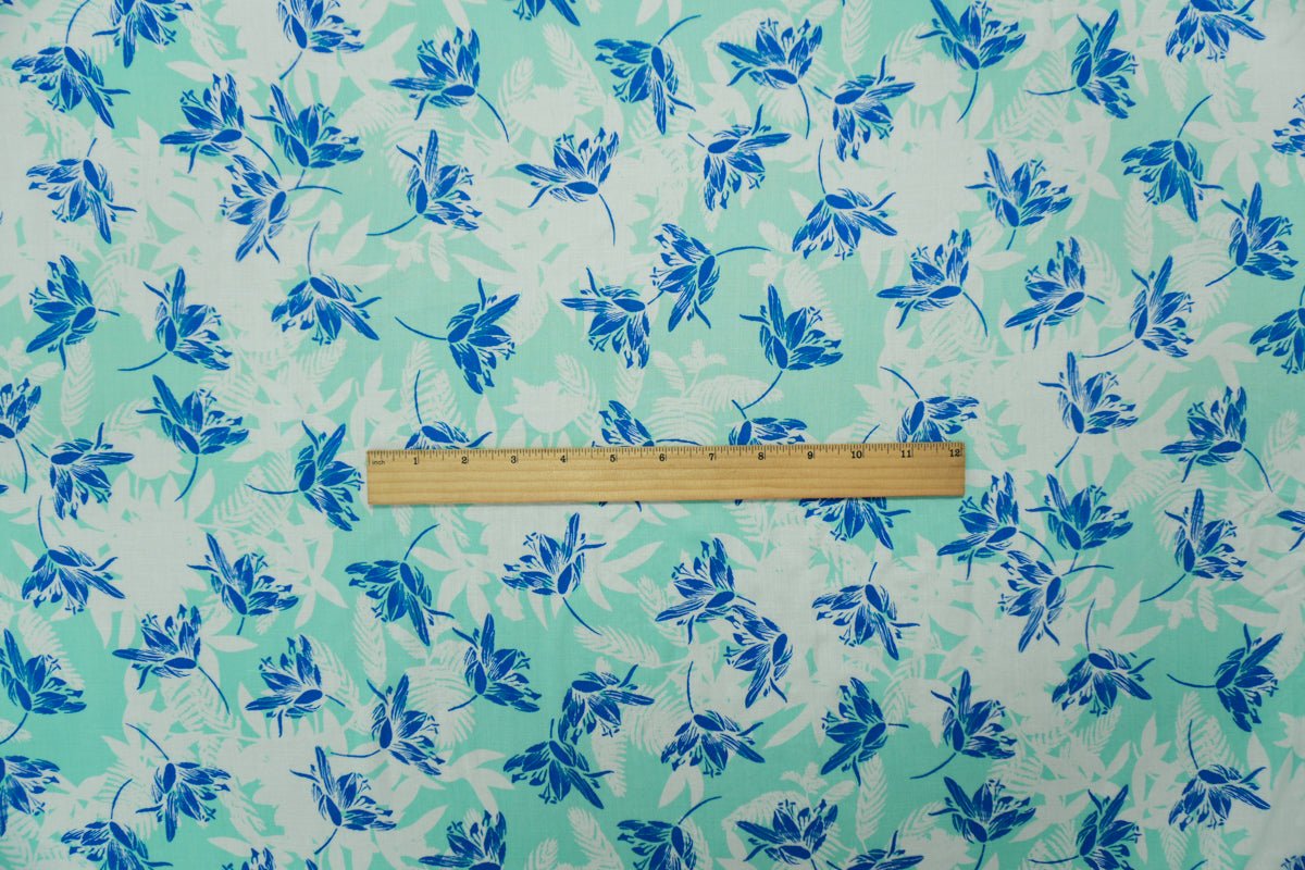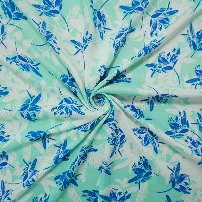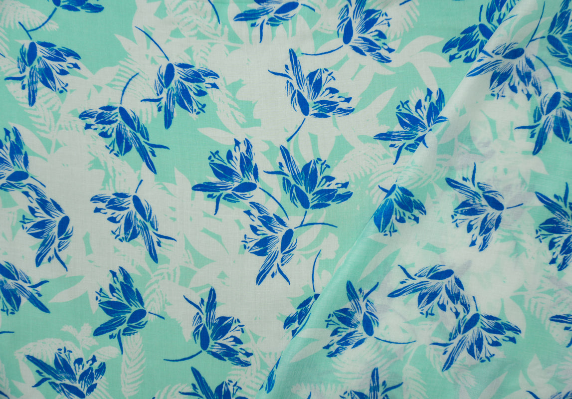 Teal-White-White Rayon Floral Printed Voile Woven Fabric