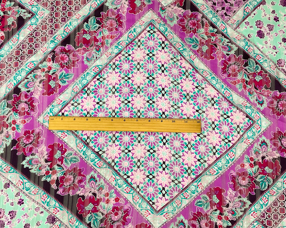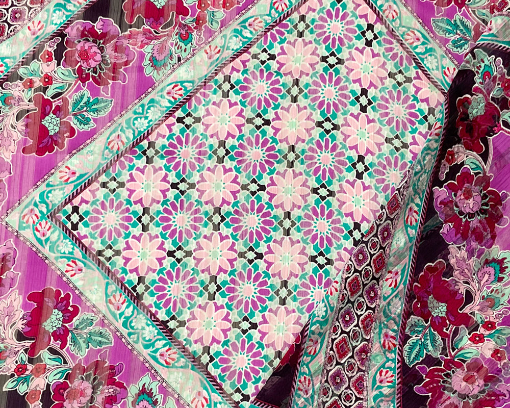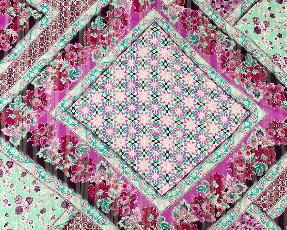 Turquoise-Multi Floral Printed Satin Stripe Chiffon Woven Fabric