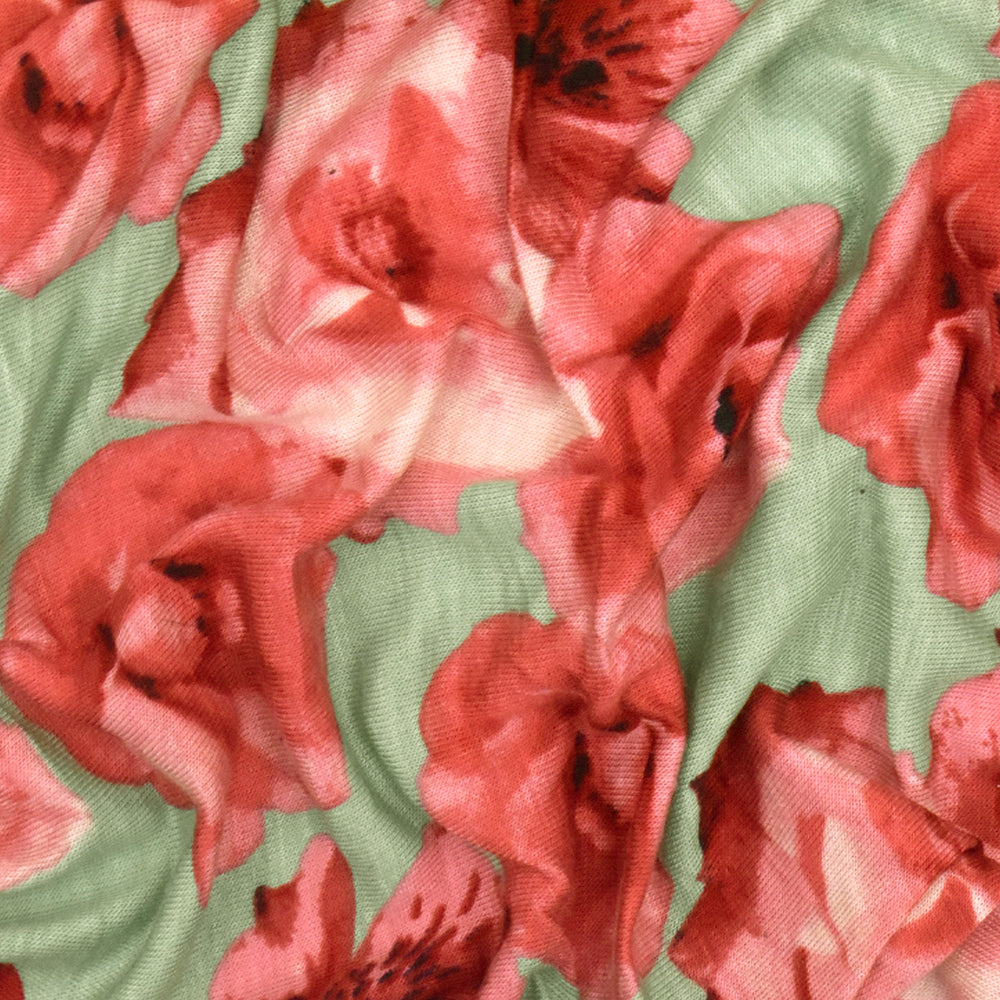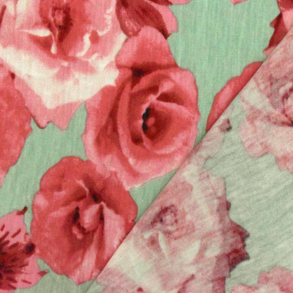 Mint Green-Pink-Multi Rose Printed Slub Rayon Stretch Jersey Knit Fabric