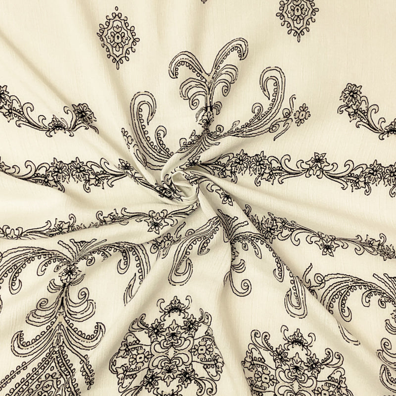 Ivory-Beige-Black Cotton Baroque Printed Gauze Woven Fabric