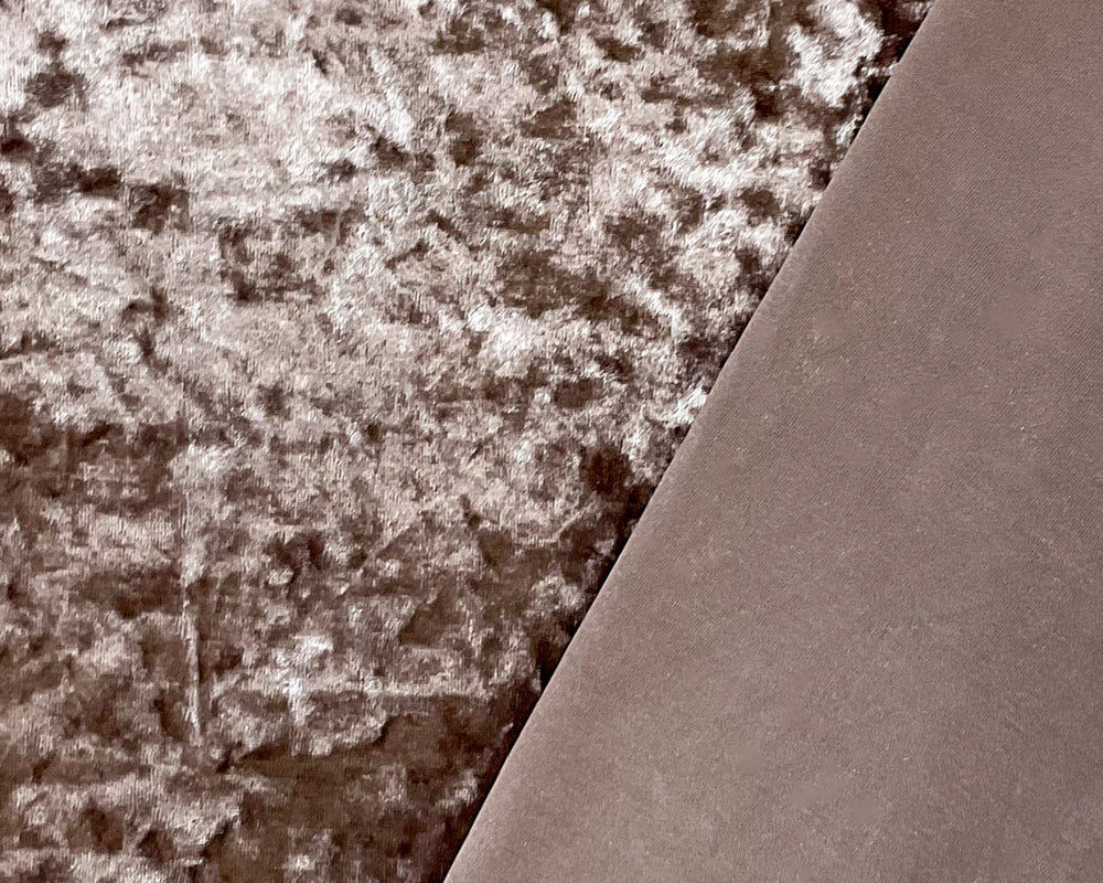 -Luxurious crushed velvet knit with poly-spandex stretch, featuring a dimensional crushed texture and soft hand feel. The two-way stretch offers comfortable movement with a lustrous sheen finish.