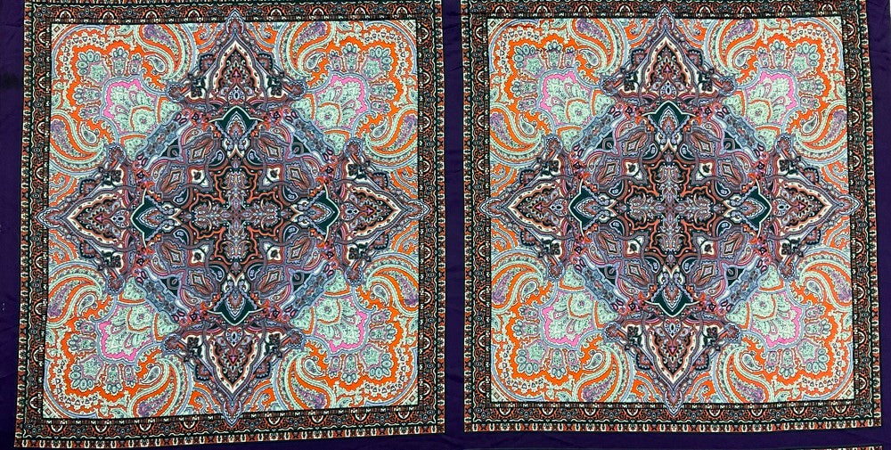 Purple-Orange-Multi Poly Paisley Bandana PANEL Printed Charmeuse Woven Fabric