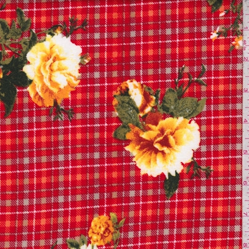 Red/Yellow Plaid Floral Double Brushed Jersey Knit Fabric
