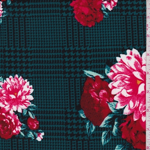 Teal/Red Glen Plaid Floral Double Brushed Jersey Knit Fabric