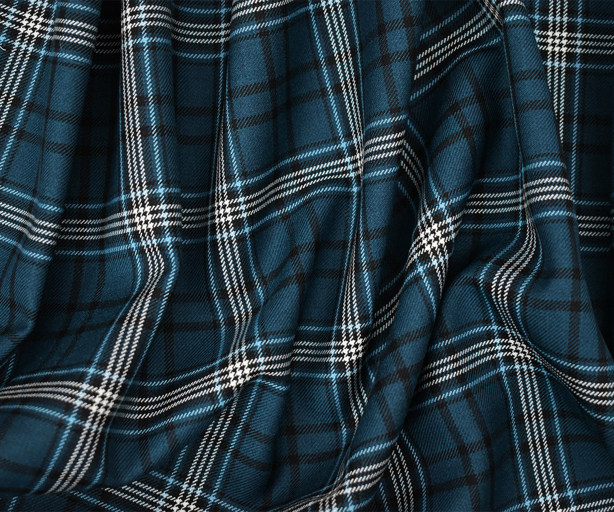 Blue-Black-White Polyester Wool Blend Plaid Twill Suiting Fabric