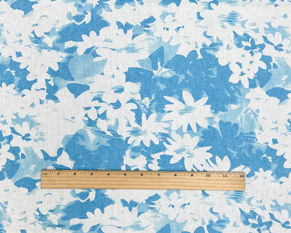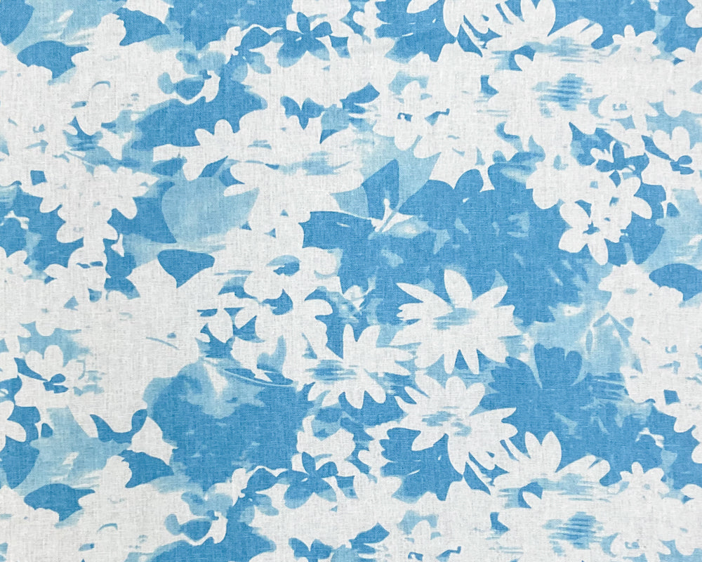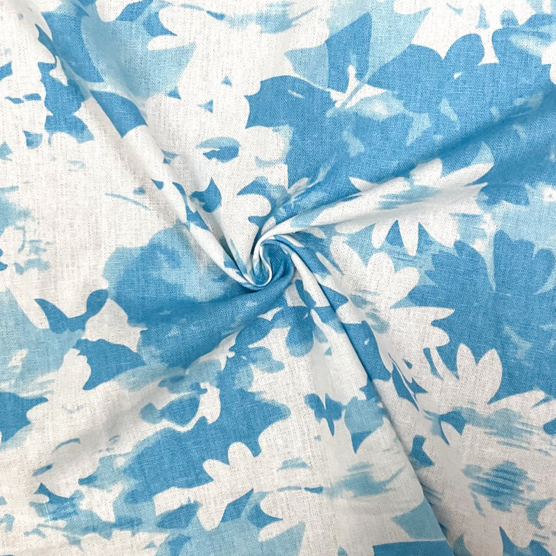 -Blue-White Cotton Ink Floral Printed Plain Woven Fabric