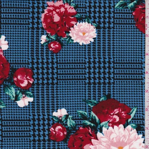 Sky Blue/Ruby Glen Plaid Floral Double Brushed Jersey Knit Fabric