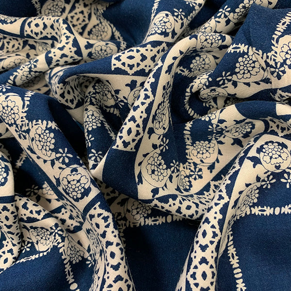 -Blue and White Lace Look Print Rayon Challis Fabric