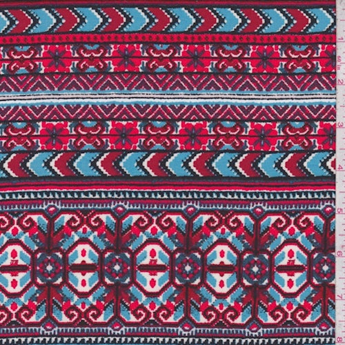 Fire Red/Sky Blue Deco Stripe Rayon Challis Fabric