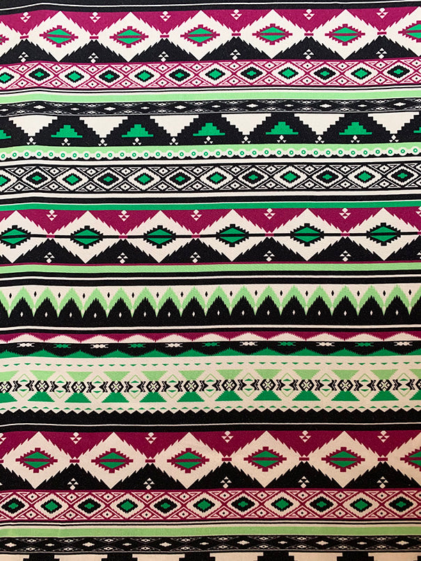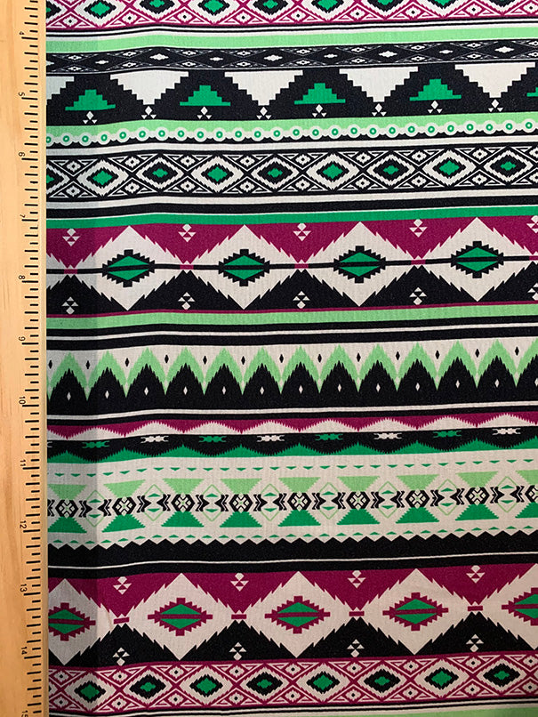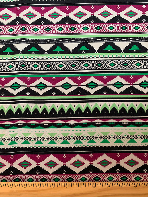 -Lime Green, Magenta, Green, Black, & Off White Multi Aztec Horizontal Stripe Print Rayon Challis Fabric