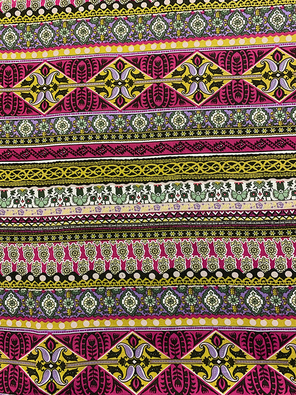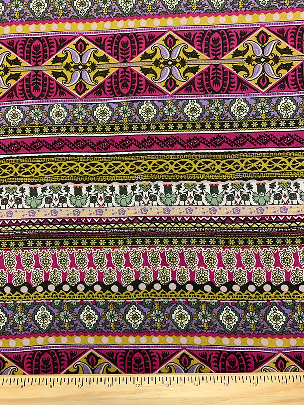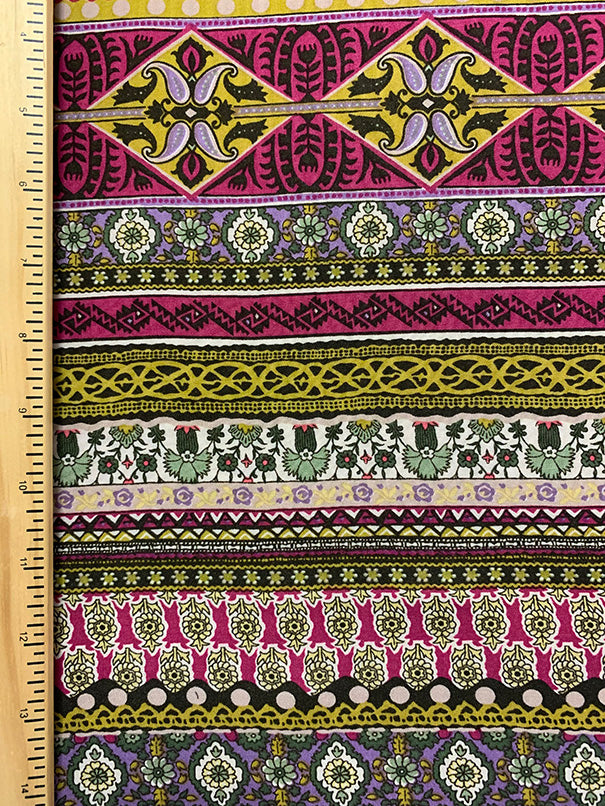 -Purple, Magenta, Brass, Off White, Light Pink, & Brown Multi Horizontal Stripe Print Rayon Challis Fabric