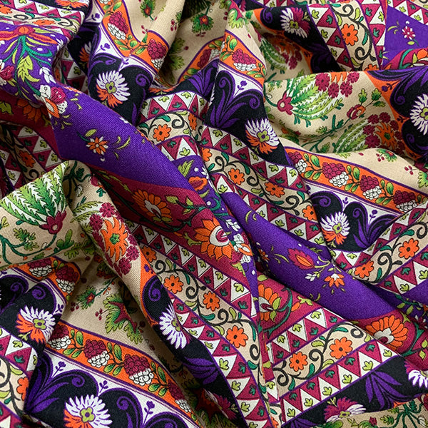 Purple Multi Floral Stripe Print Rayon Challis Fabric