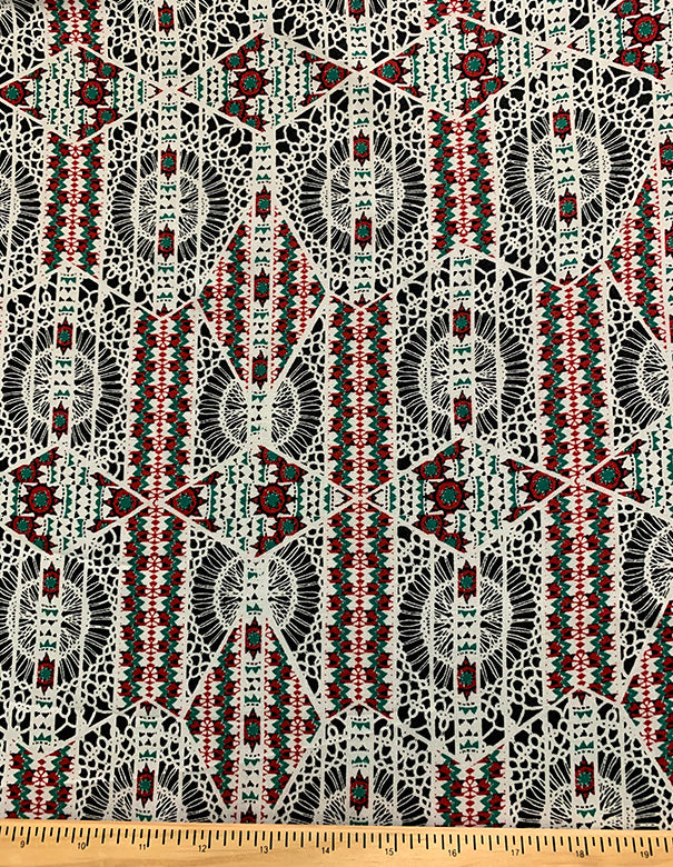 -Red, Green, Black, White Lace Look Print Rayon Challis Fabric