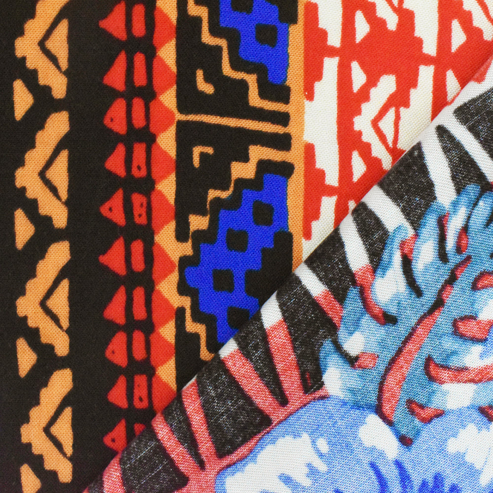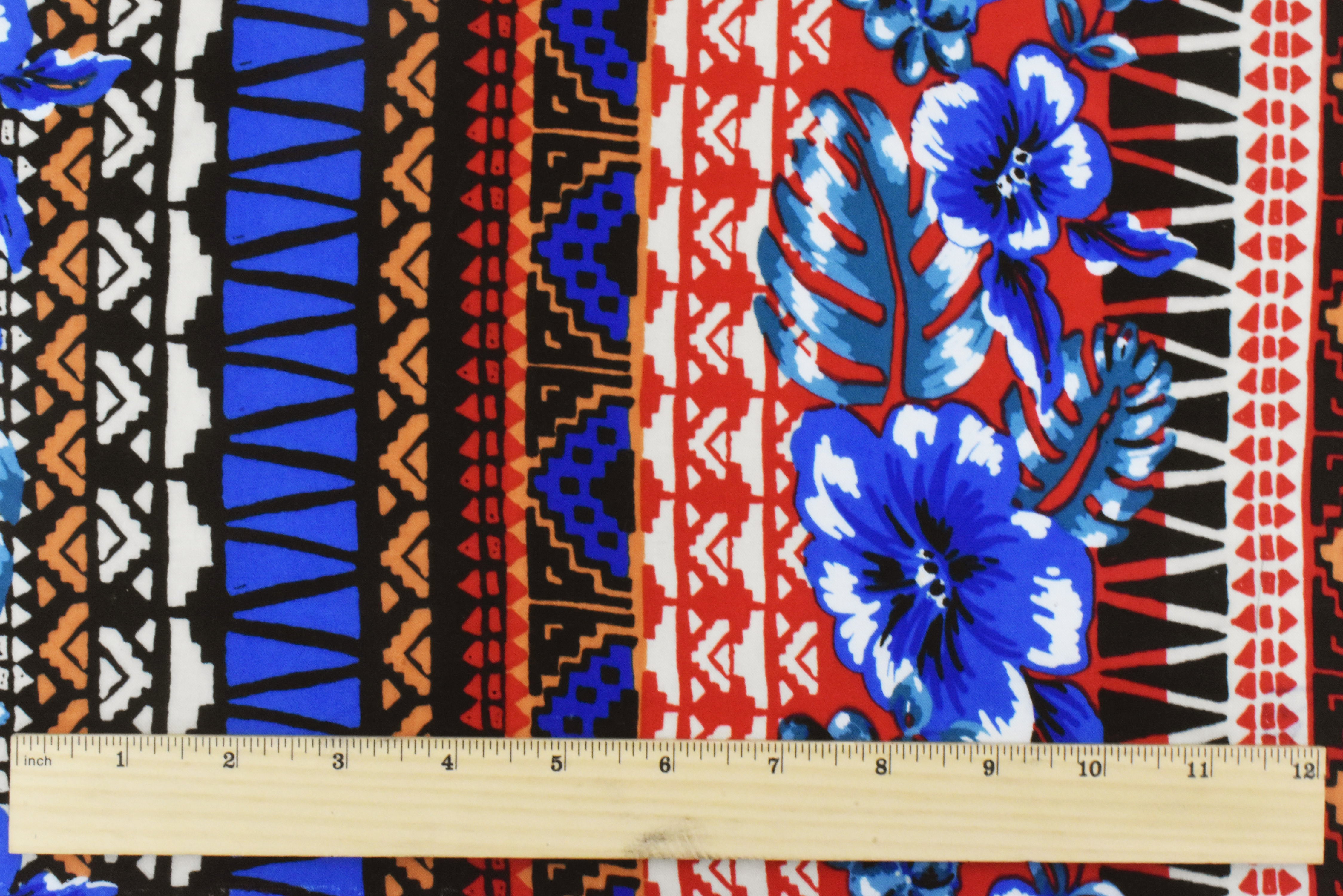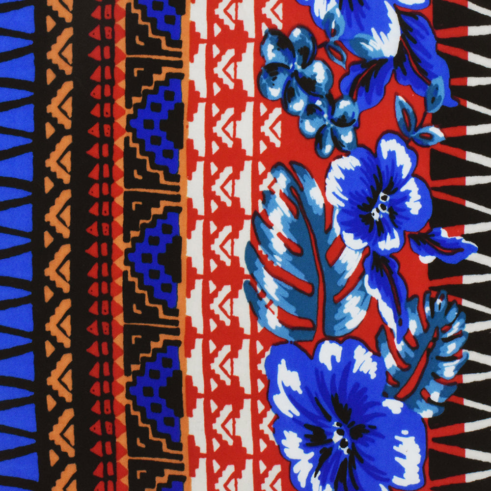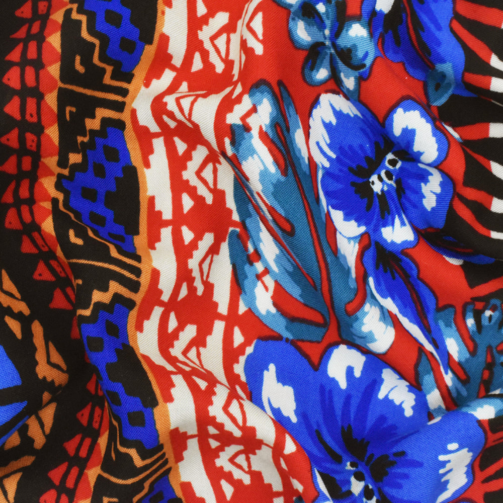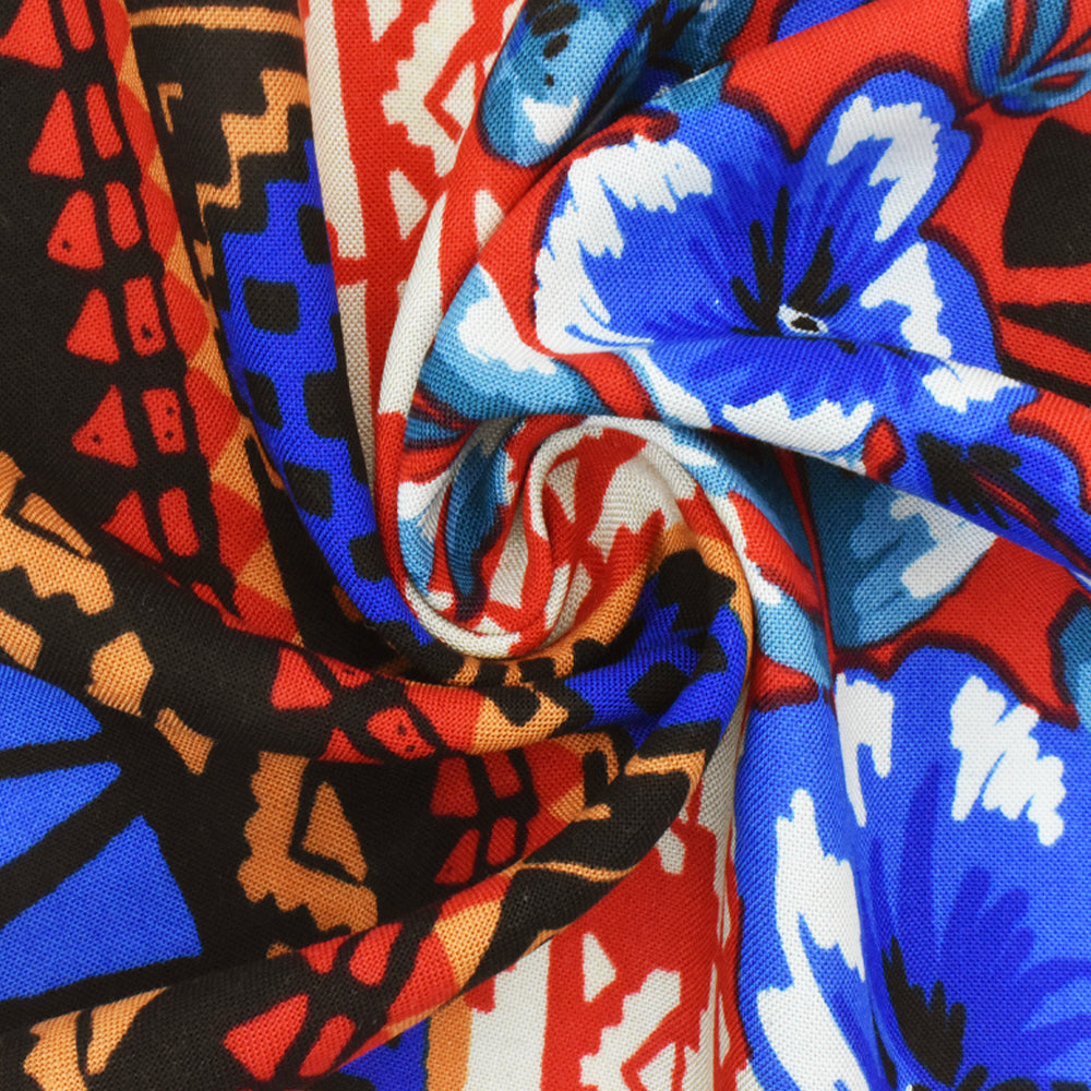 Red-Blue-Multi Floral Tribal Stripe Printed Challis Fabric