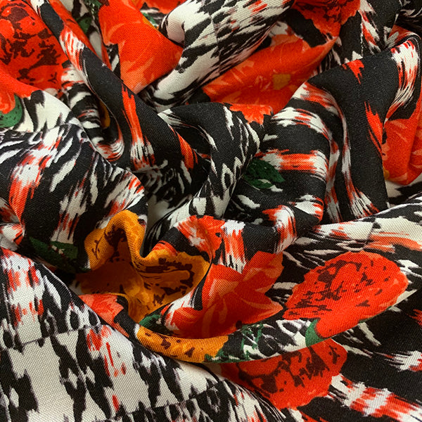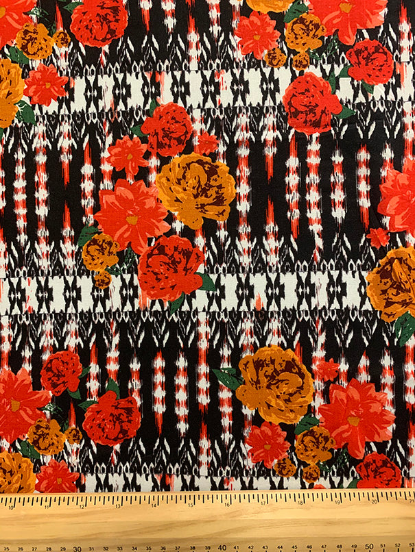 -Red, Orange, Rust, White, Black, & Green Rose Novelty Stripe Print Rayon Challis Fabric
