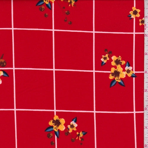 Cherry Red/Gold Windowpane Check Floral Double Brushed Jersey Knit Fabric