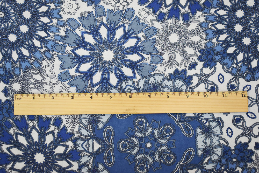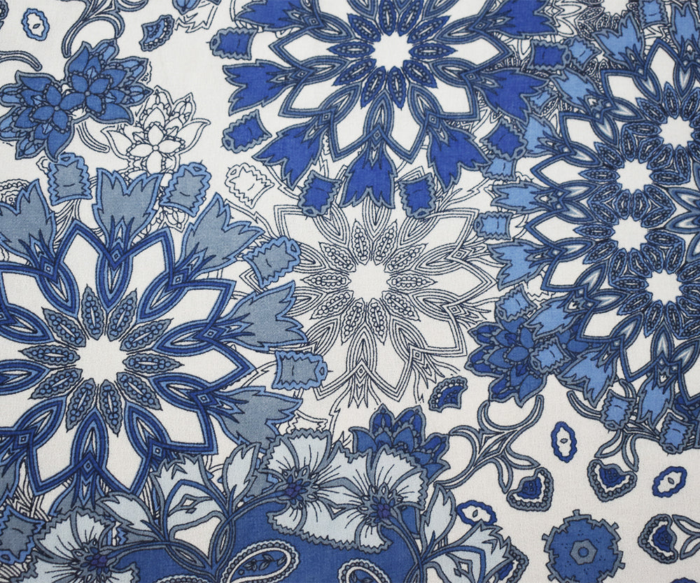 Blue-White Floral Medallion Printed Poly Chiffon Woven Fabric