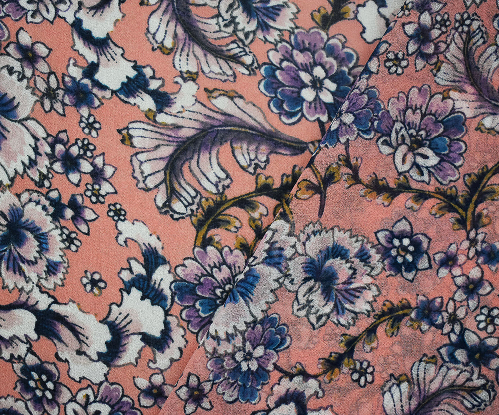 Coral Orange-Pink-Multi Floral Printed Pebble Chiffon Woven Fabric