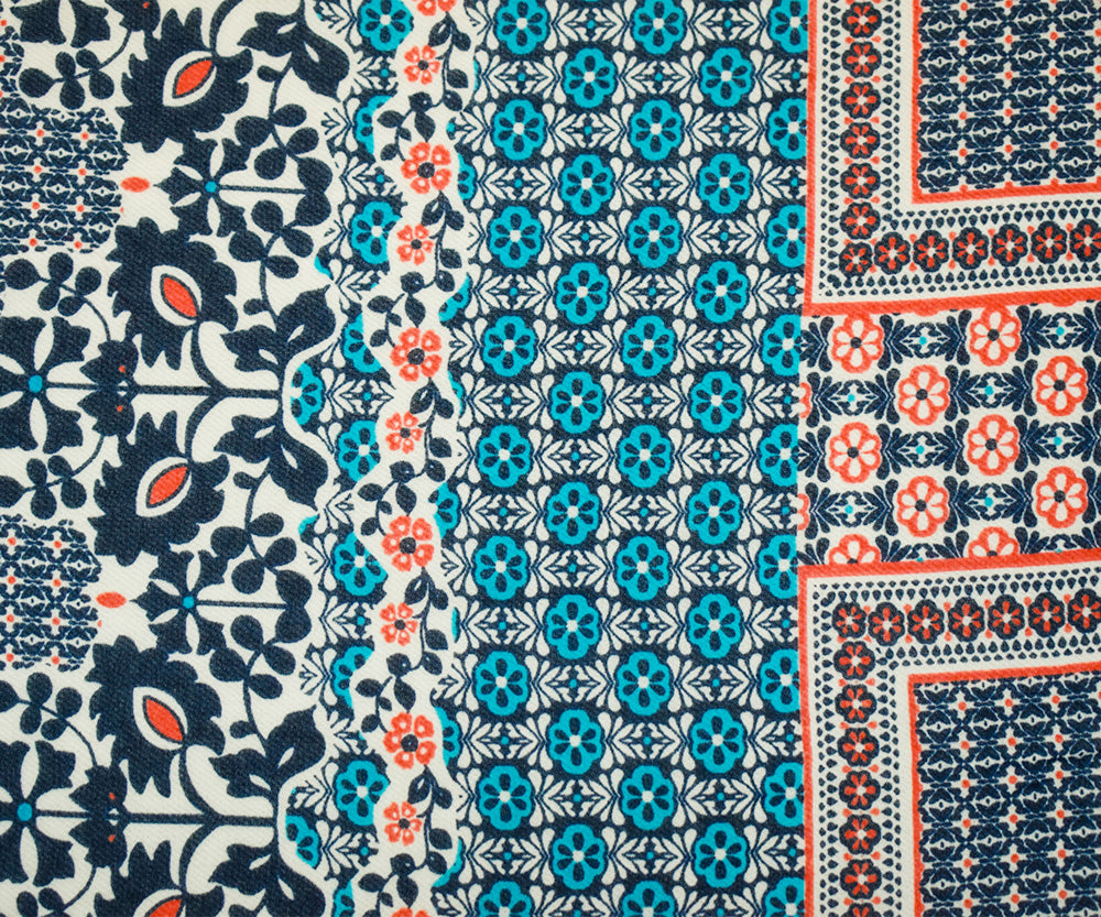 -100% Polyester chiffon woven fabric printed with a bordered style pattern with elements of florals and geometric shapes.