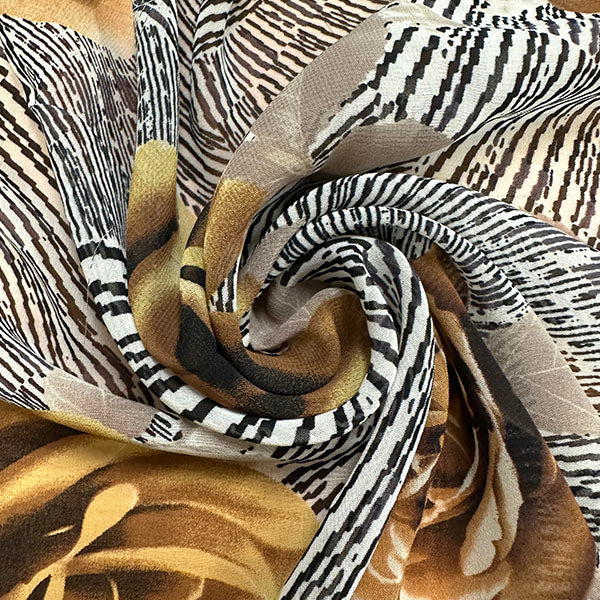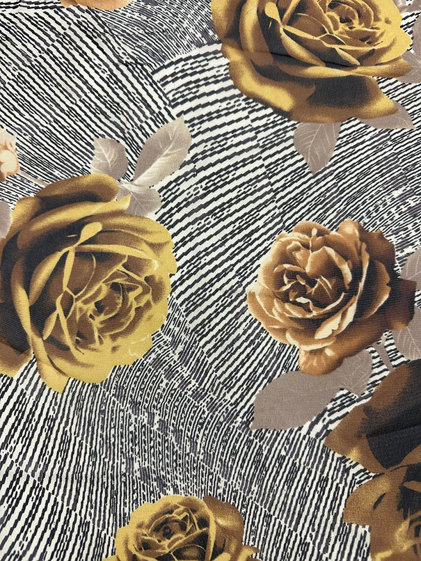-Gold, Tan, & Yellow Roses Floral Print on Black & White Multi Direction Stripe Print Sheer Poly Chiffon Fabric