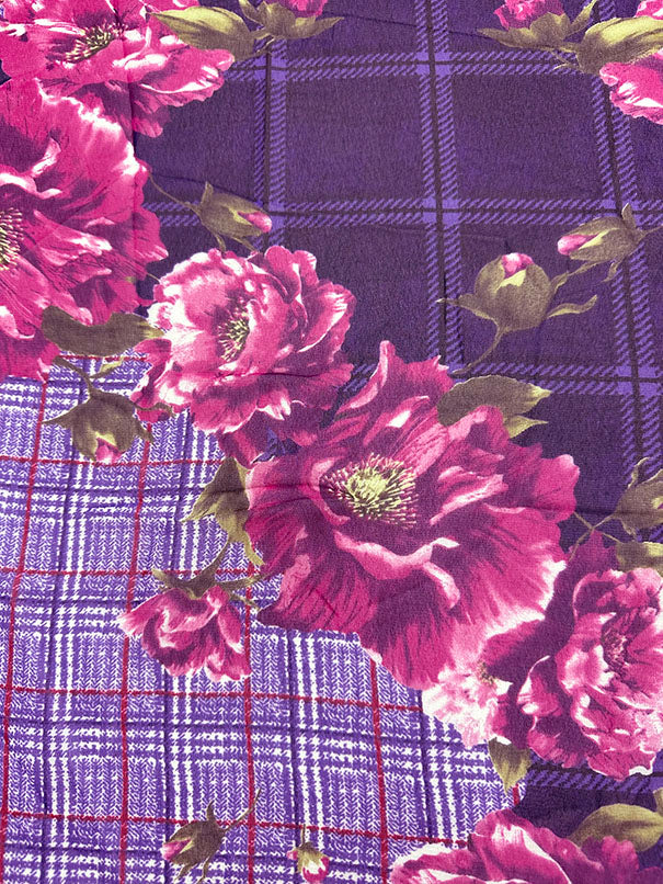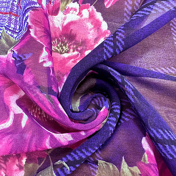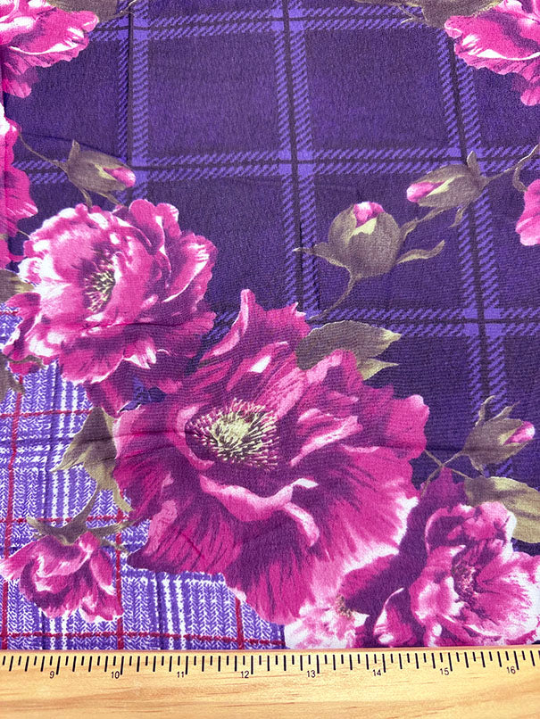 Purple Plaid Floral Print Poly Chiffon Fabric