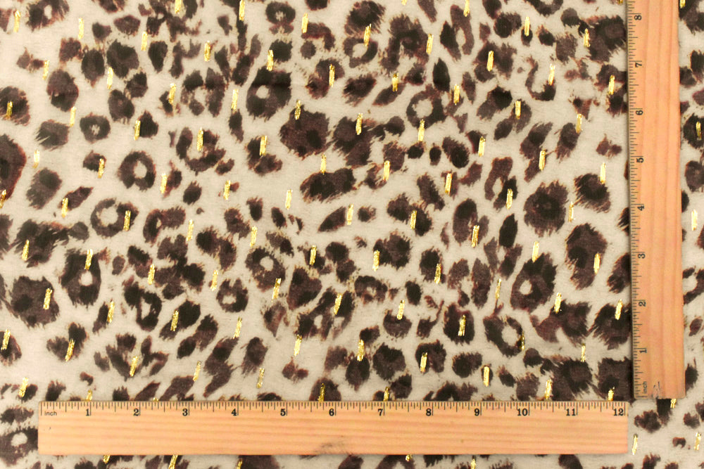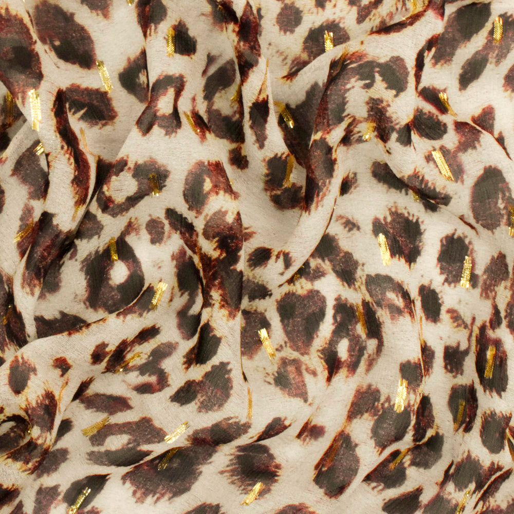 -Famous designer cheetah pattern printed on a 100% viscose chiffon woven fabric with small strips of metallic gold.