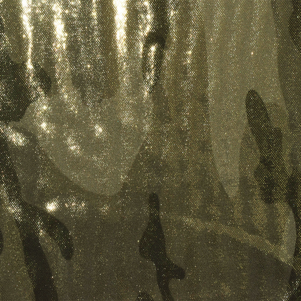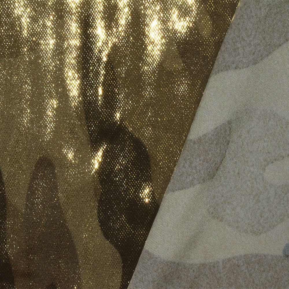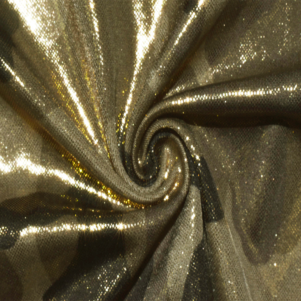 -260 GSM, metallic gold micro dots foil-over printed on a camouflage print from a famous activewear company, made in Brazil