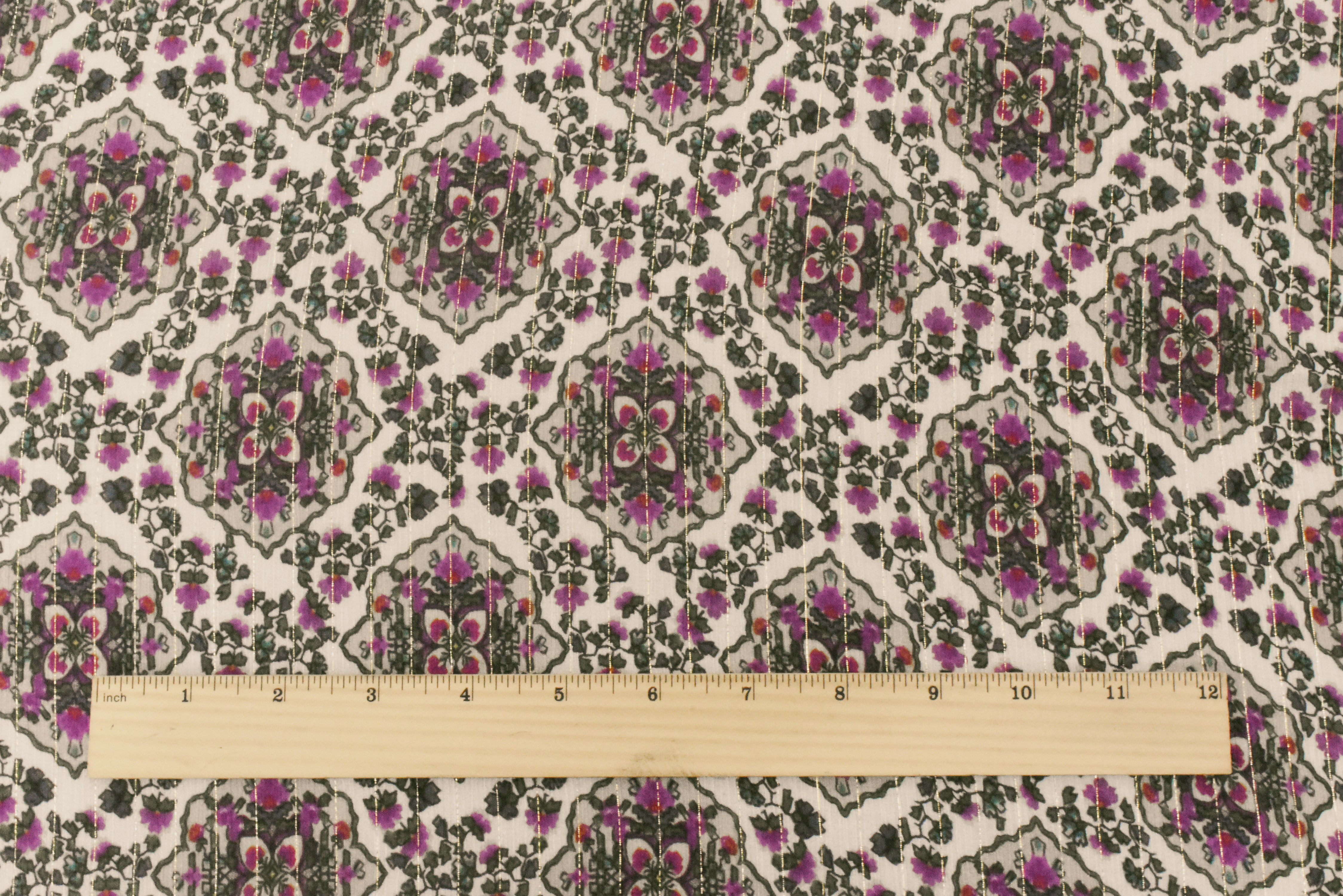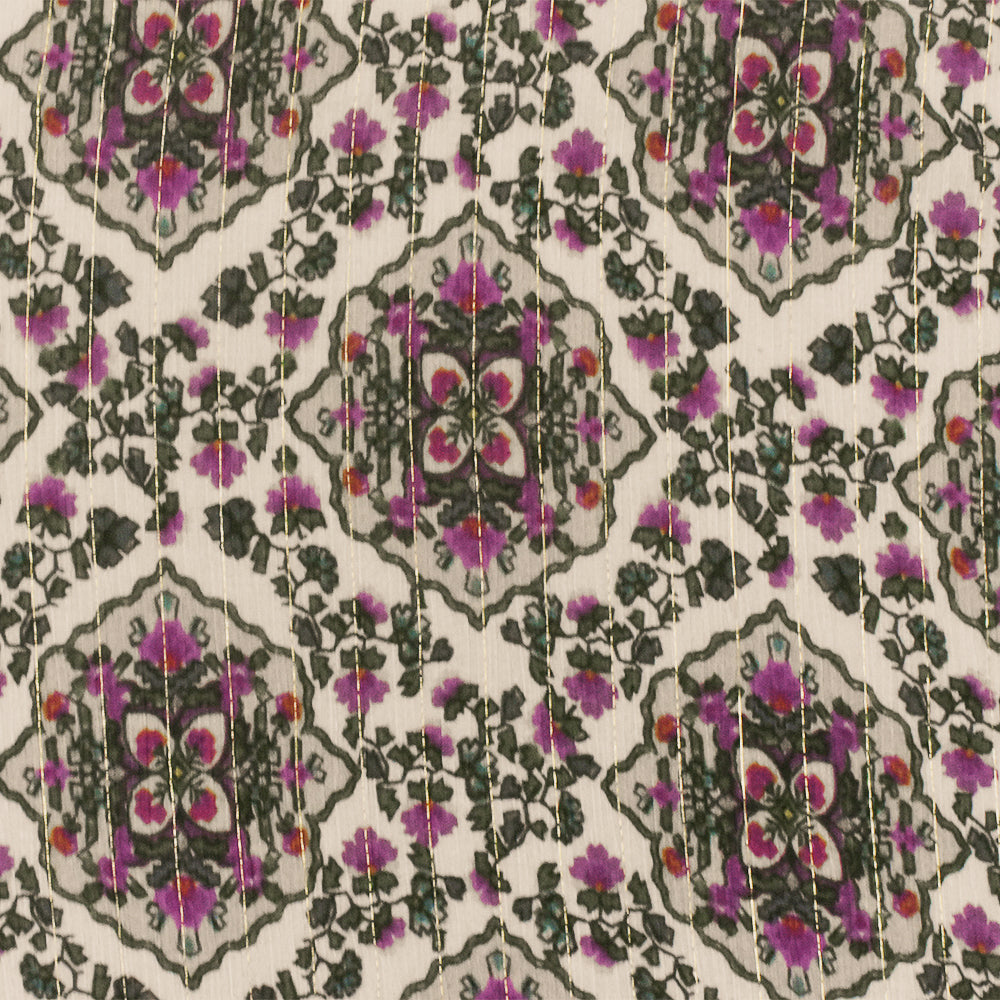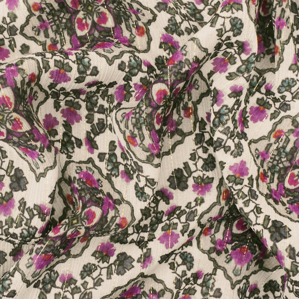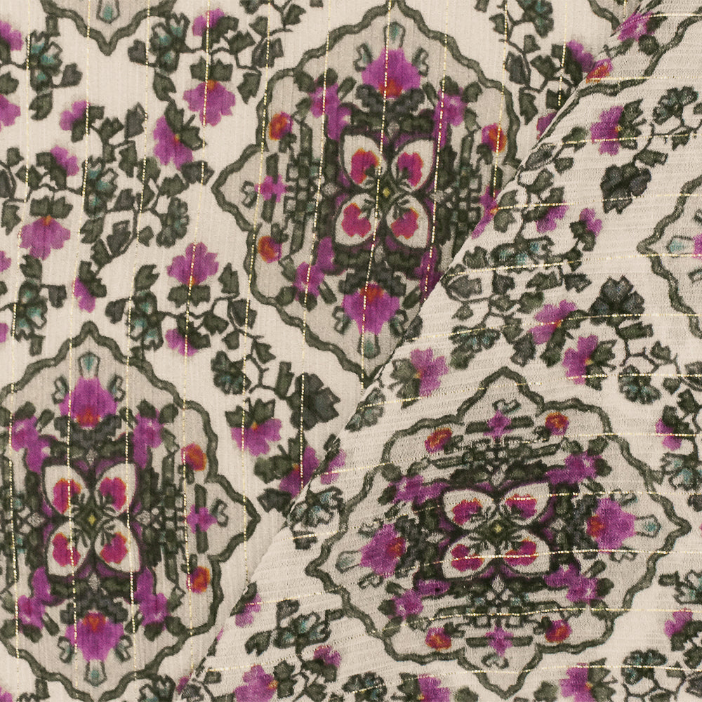 -Famous designer Viscose, silk, & metallic blend crinkled chiffon woven fabric printed with a Moroccan inspired pattern