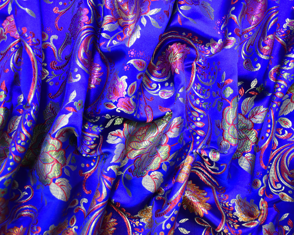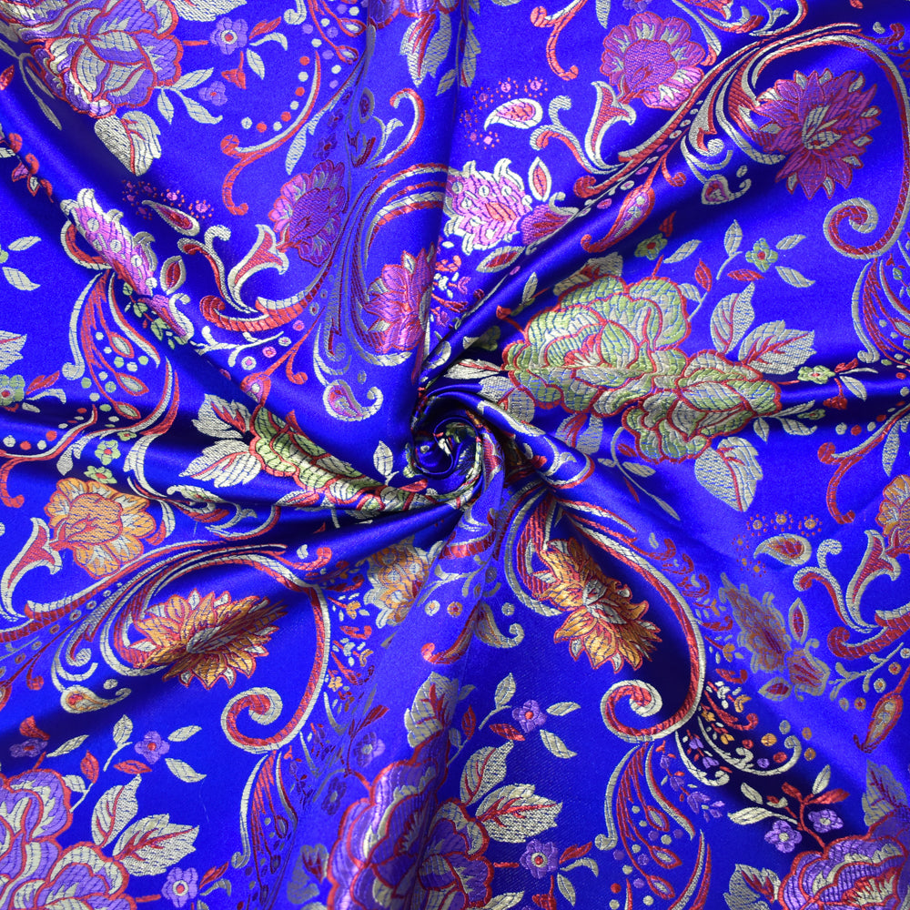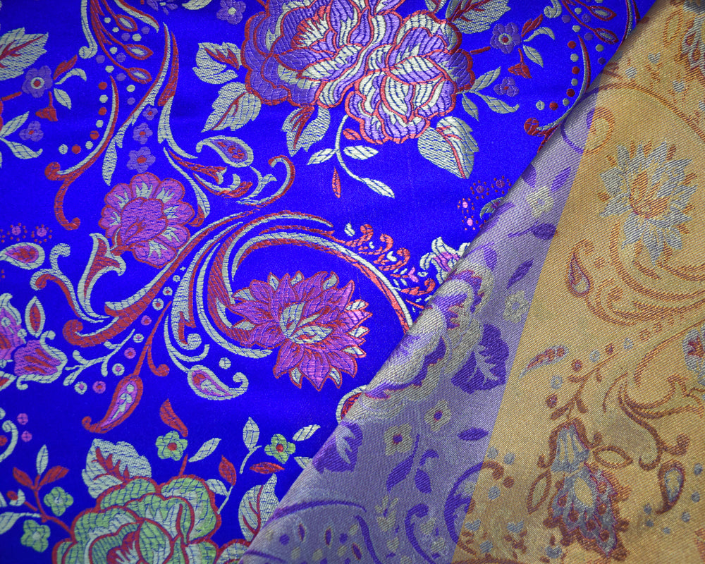 Blue-Yellow-Multi Polyester Floral Vine Chinese Brocade Woven Fabric