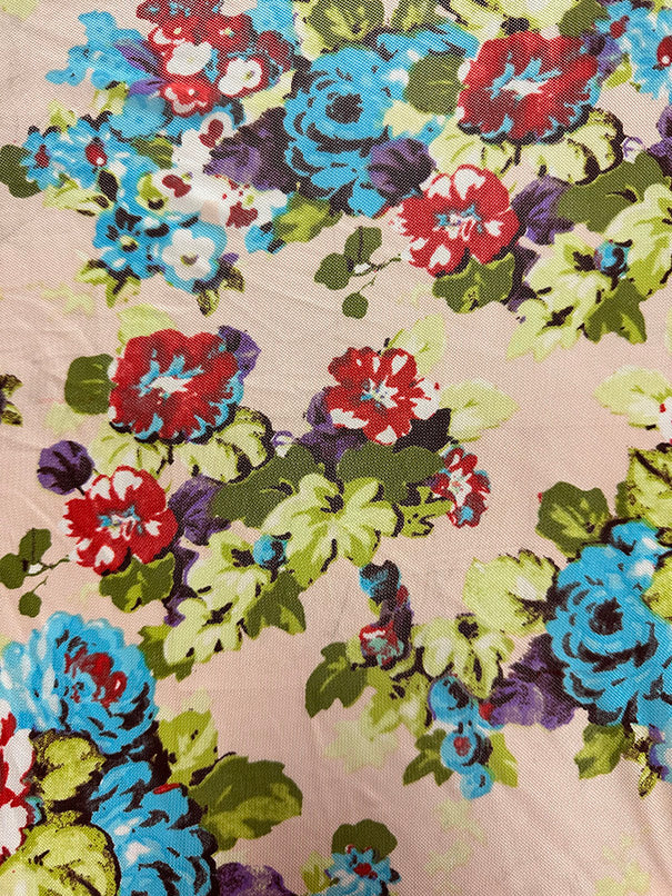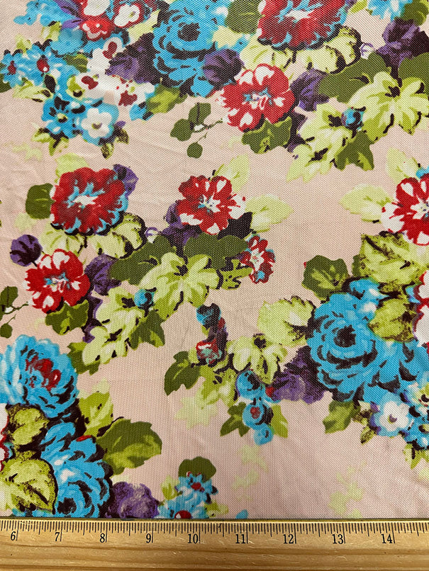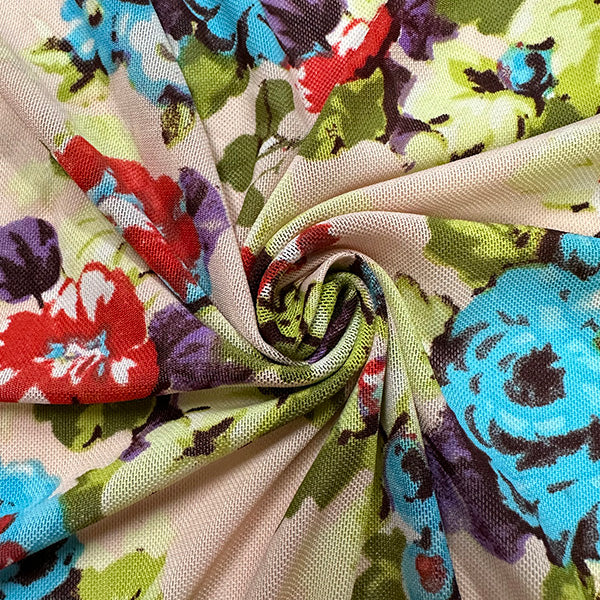 -Blue, Red, Purple, Green, & Off White Floral Print on Light Peach Stretch Mesh Fabric
