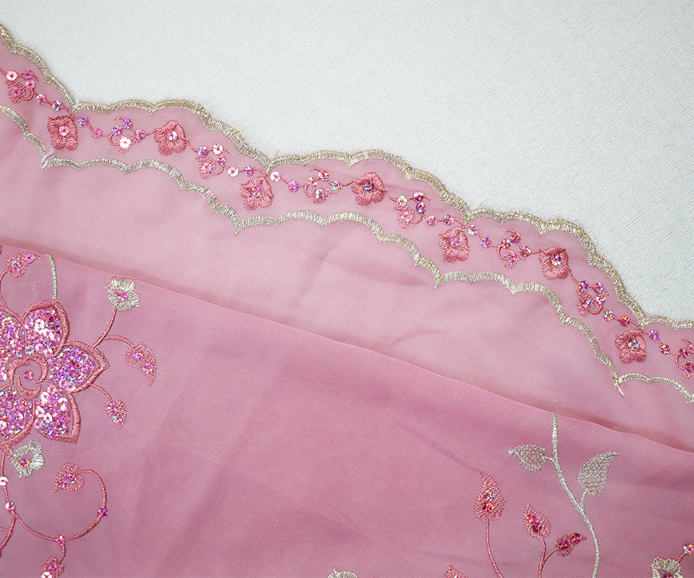 -100% Polyester chiffon scalloped embroidered selvedge with floral designs and sequins for taht added detail.