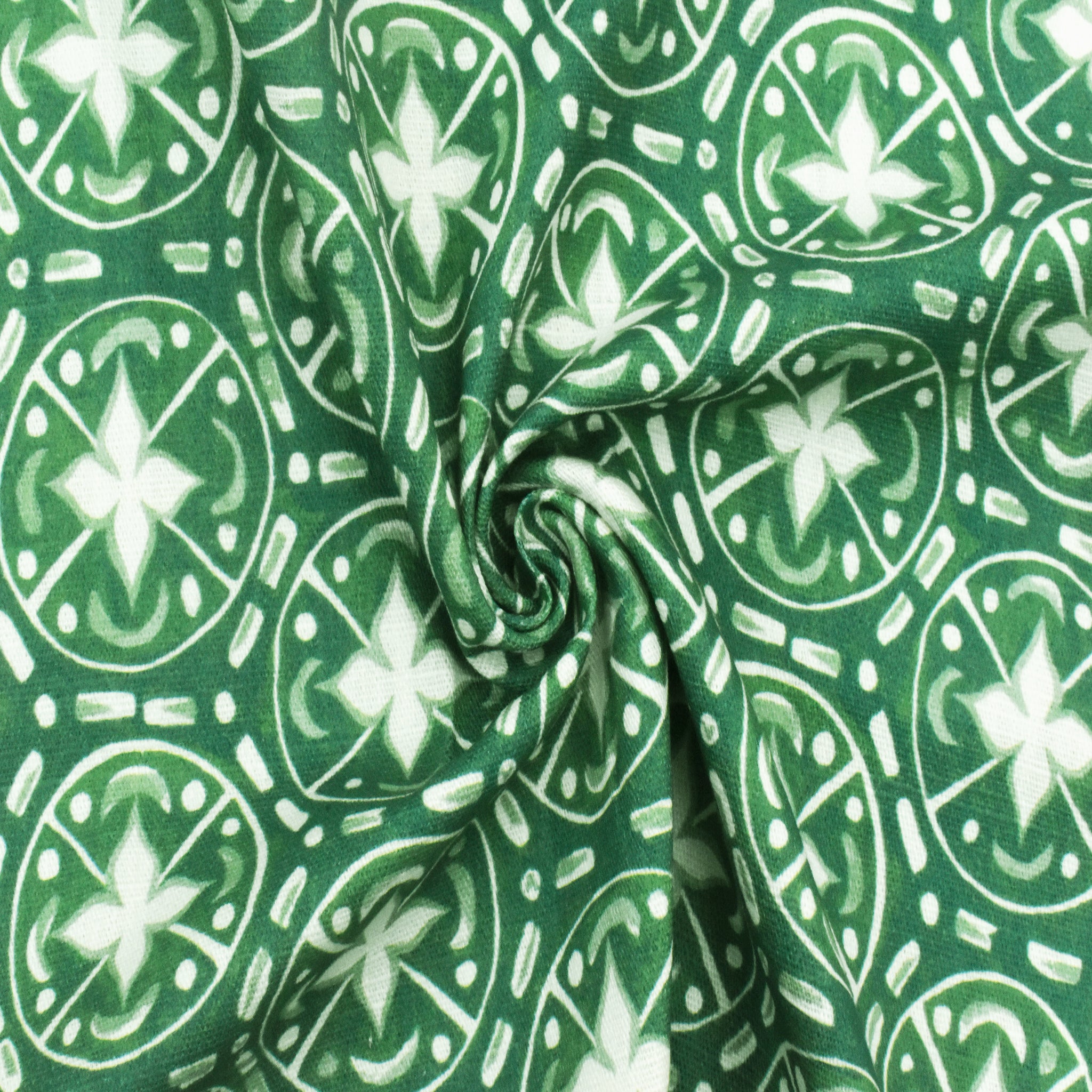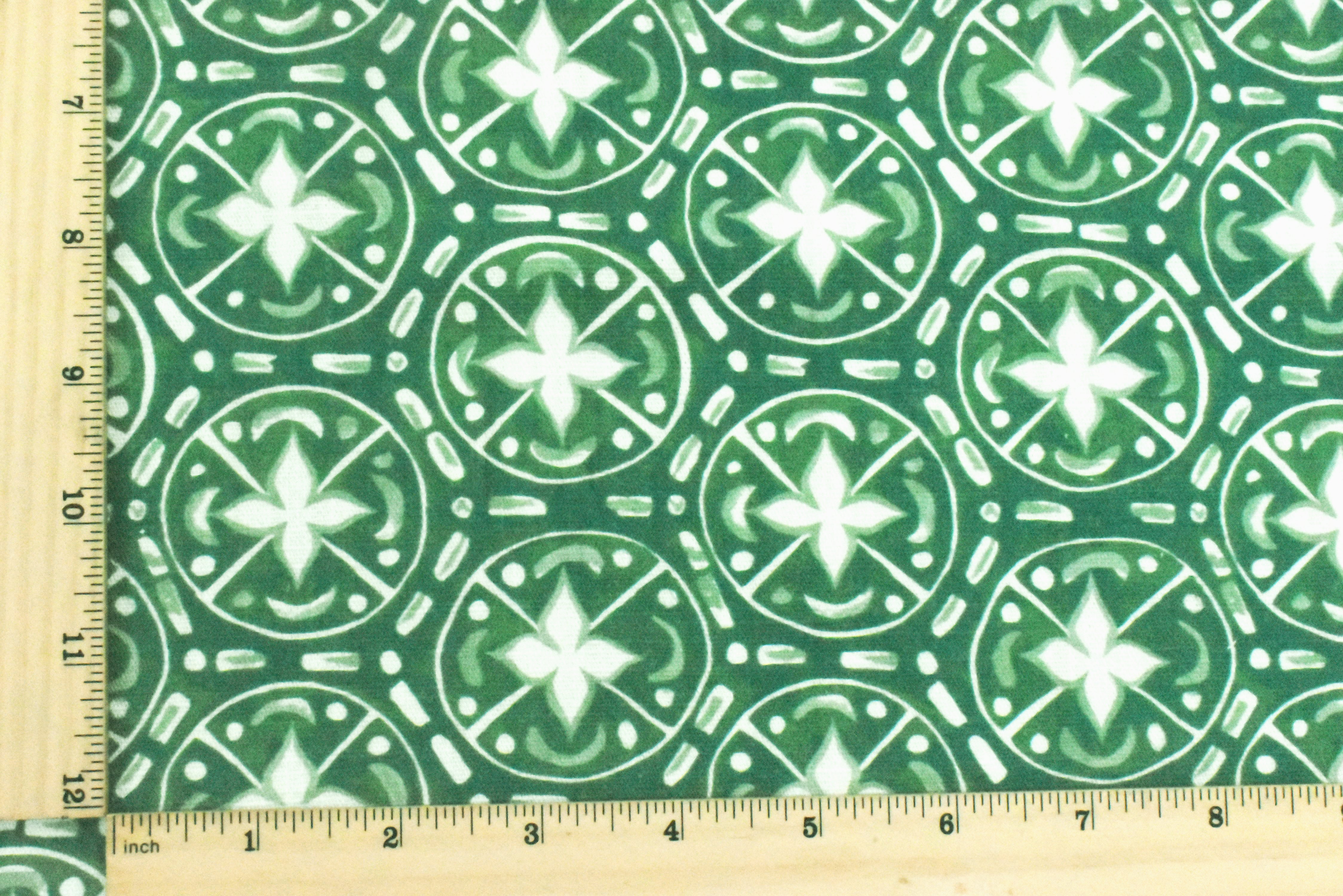 -100% cotton slubbed woven fabric printed with a tile-like morrocan inspired pattern