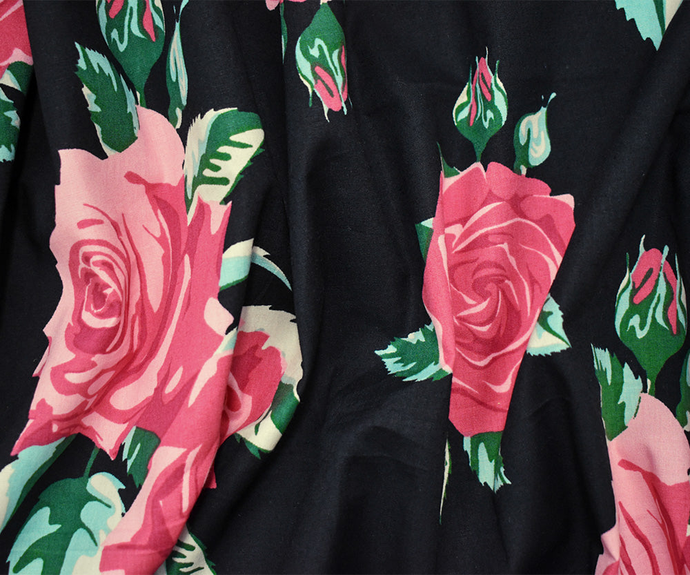 Black-Pink-Green Cotton Stretch Spandex Floral Printed Poplin Woven Fabric