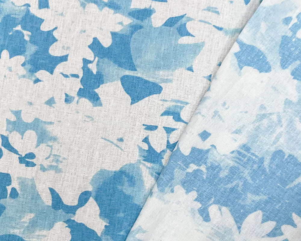 -Blue-White Cotton Ink Floral Printed Plain Woven Fabric