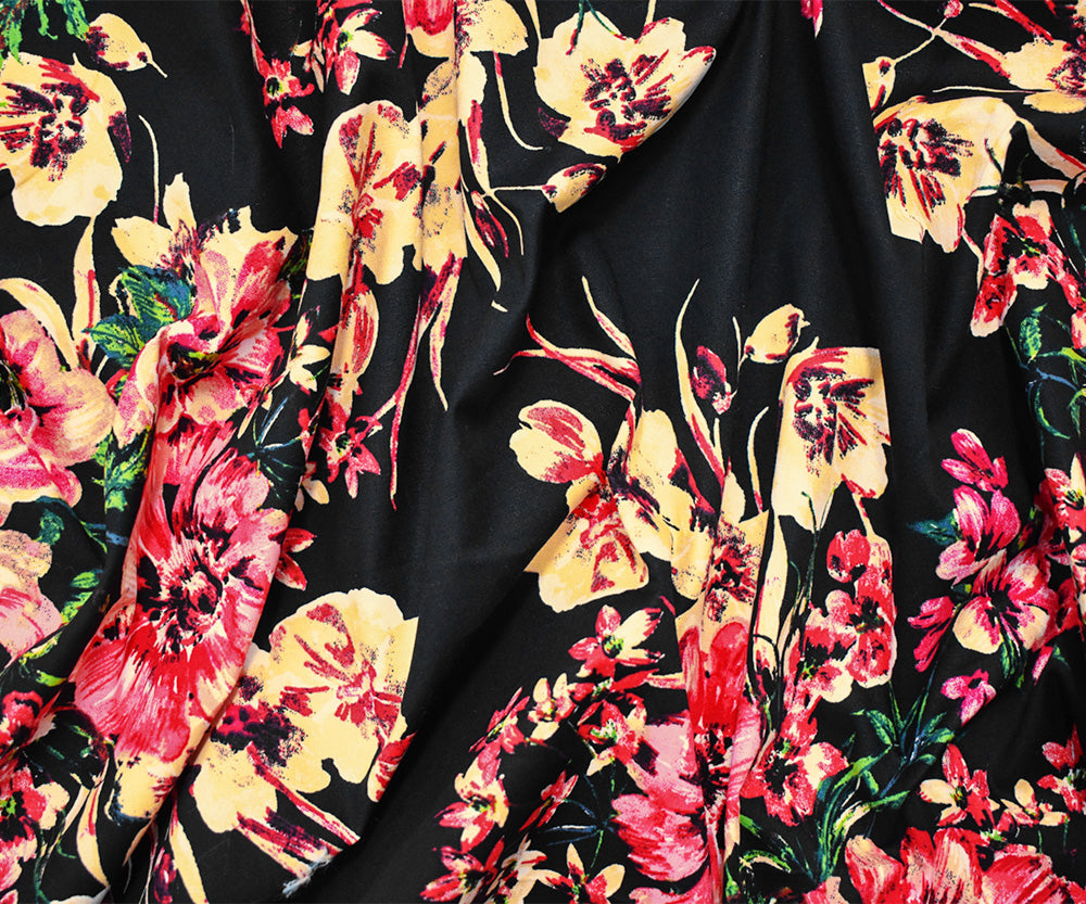 Black-Red-Multi Cotton Floral Print Stretch Spandex Poplin Woven Fabric