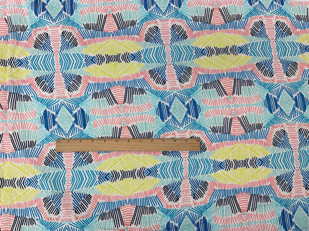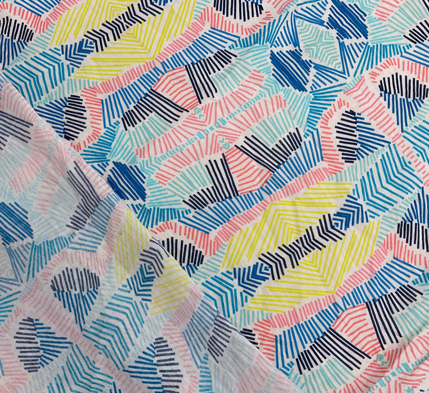 -This cotton fabric presents an abstract print on an open, airy gauze weave. The semi-sheer construction provides a soft, ethereal drape, perfect for layered blouses and delicate scarves.