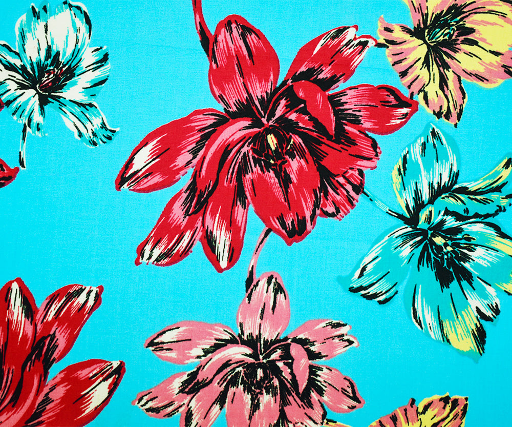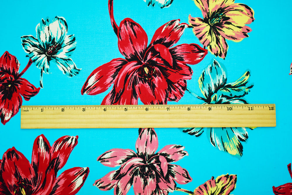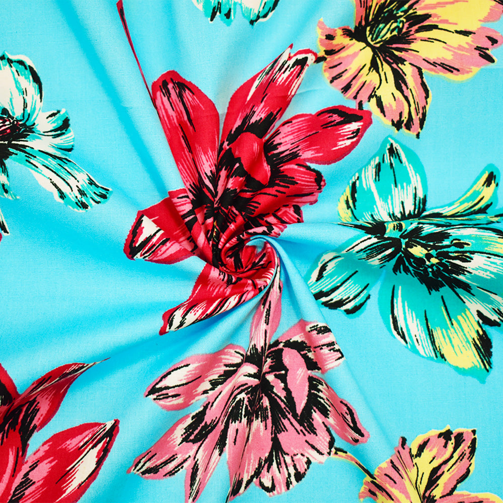 Blue-Red-Multi Cotton Floral Print Stretch Spandex Poplin Woven Fabric