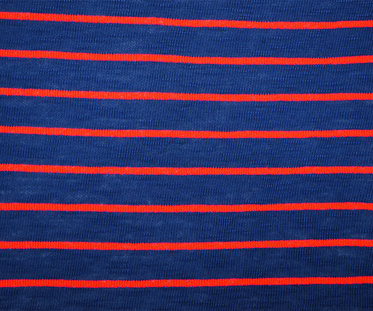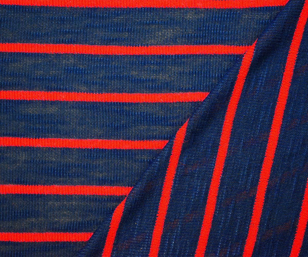 Blue-Red-Multi Cotton Semi-Sheer Slub Striped 1x1 Rib Knit Fabric