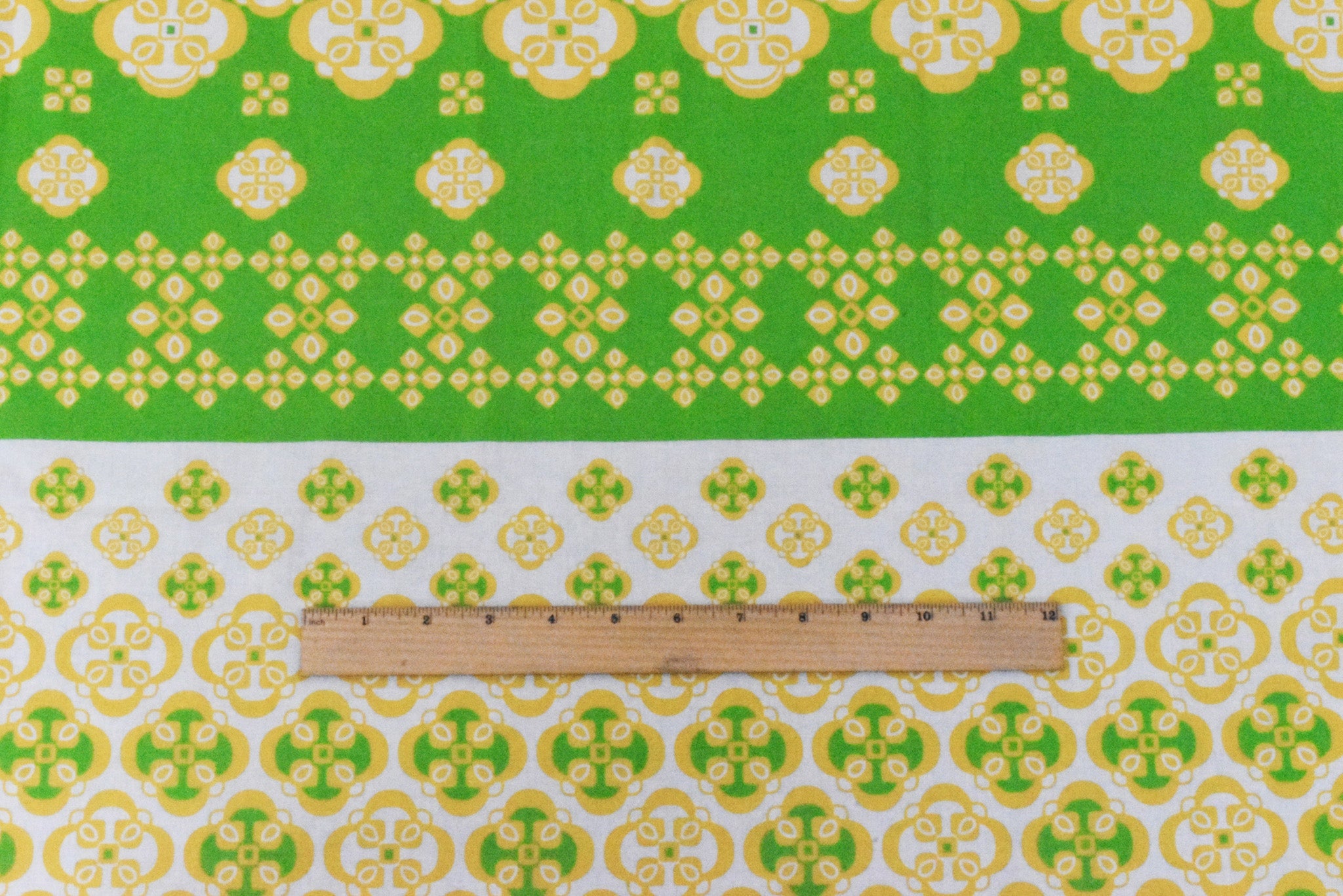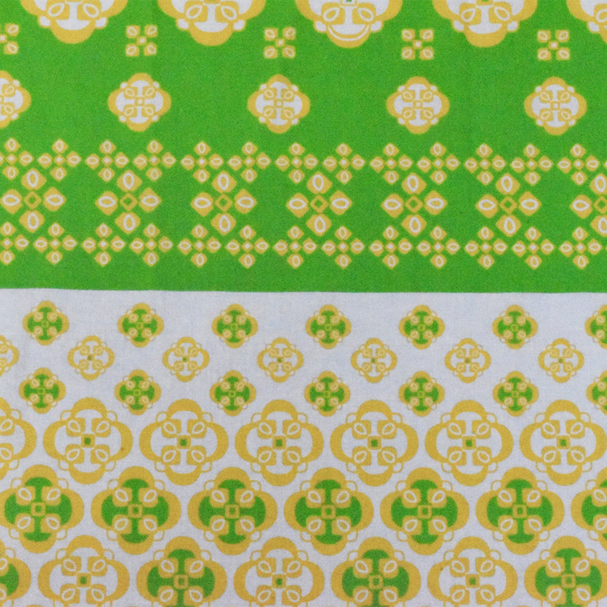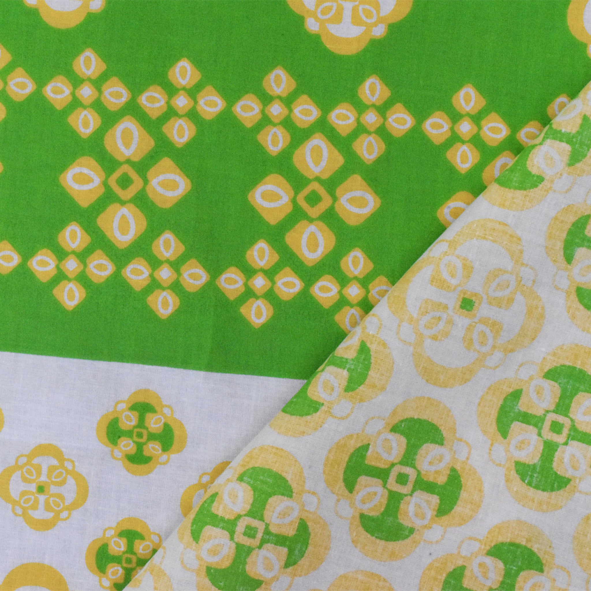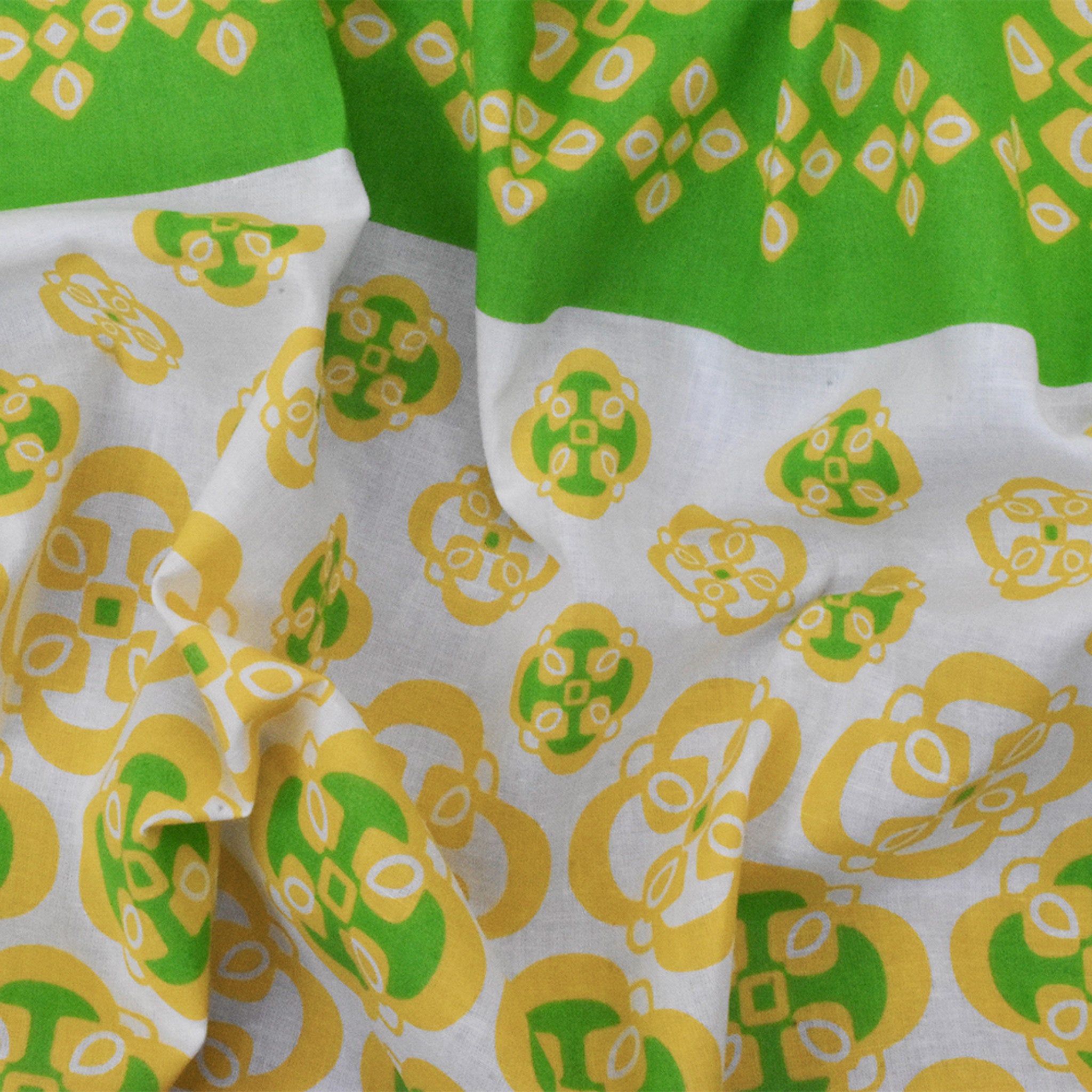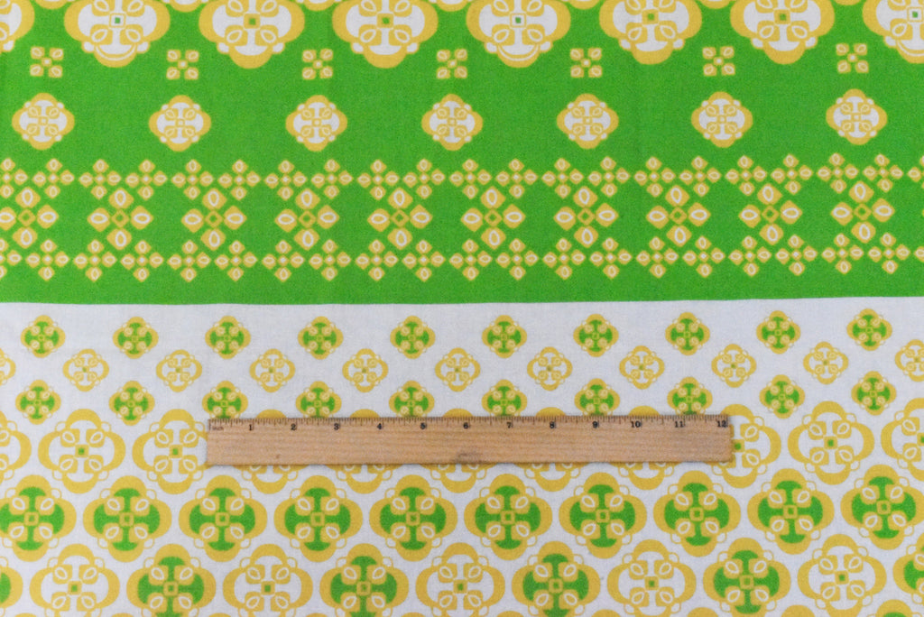 Ivory-Yellow-Green Striped Quatrefoil Printed Cotton Voile Woven Fabric