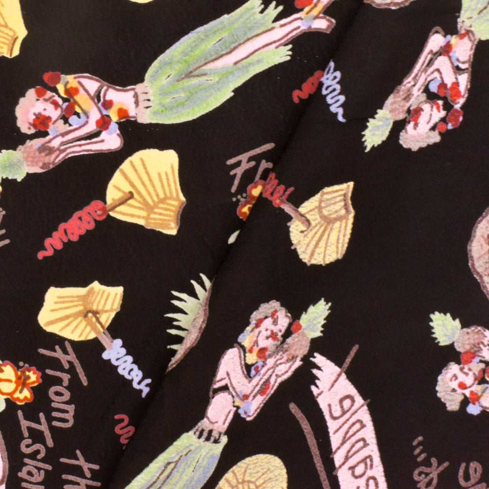 -100% rayon Hawaiian themed pattern printed crepe faille woven fabric, line if needed.