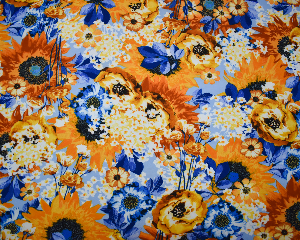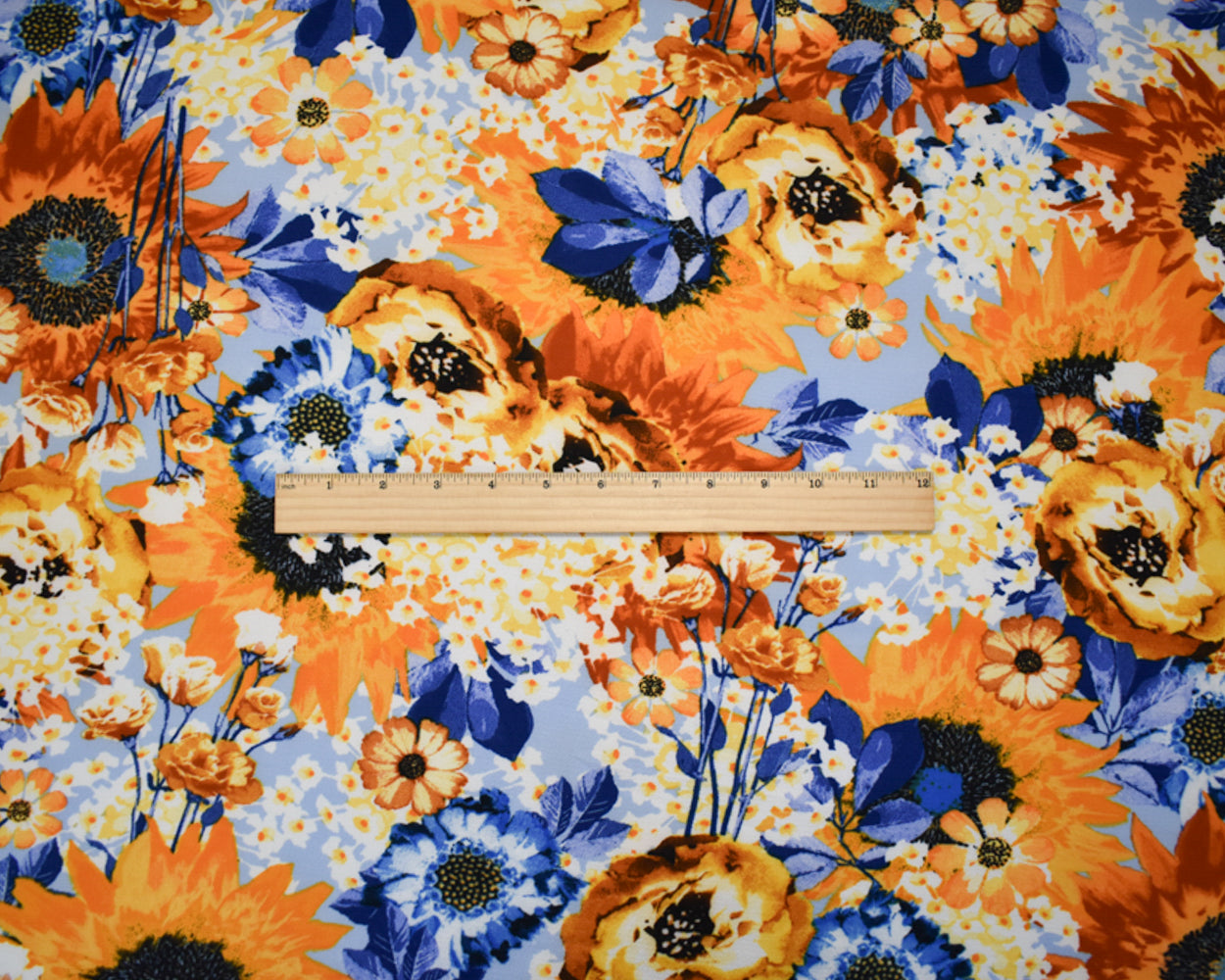 Orange-Blue-Multi Poly Floral Print Pebble Crepe Woven Fabric