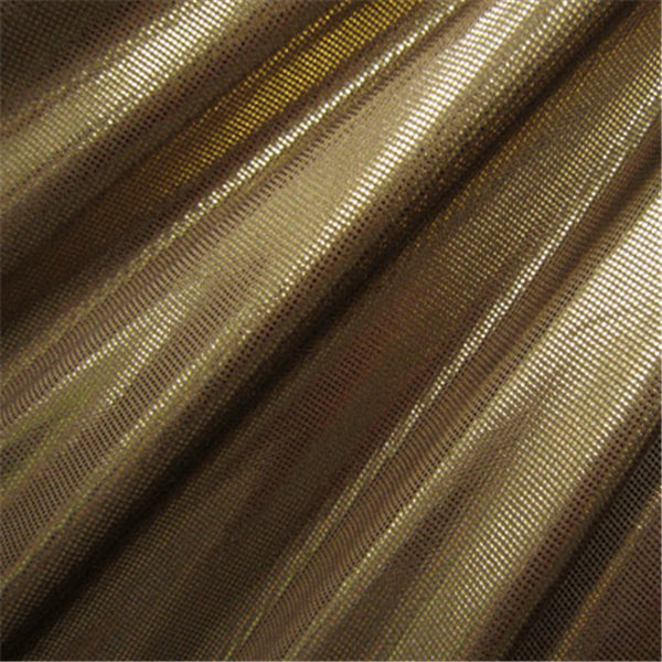 Metallic Copper Laser Foil Dot Print on Brown Spandex Fabric 4 Way Stretch Suitable for Dancewear, Apparel, & Costumes 80% Nylon 20% Spandex 58" Wide