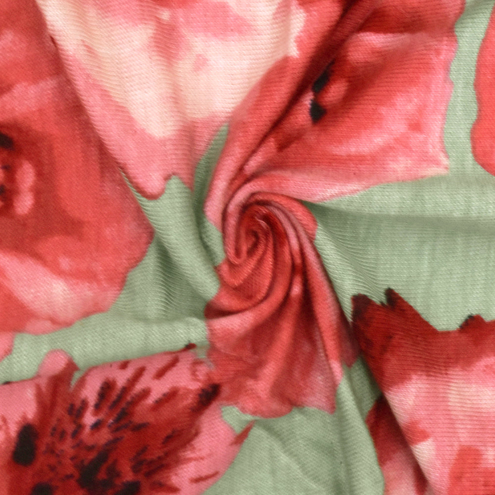 -Rayon slubbed jersey knit fabric printed with a rose pattern